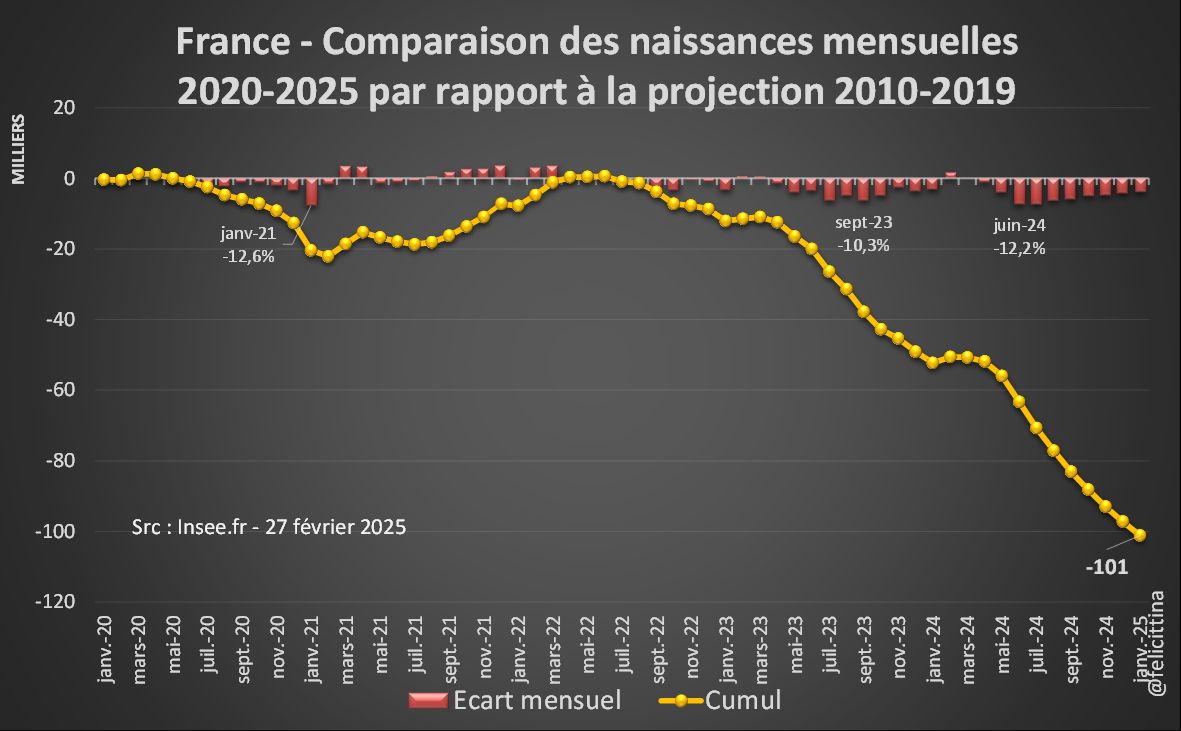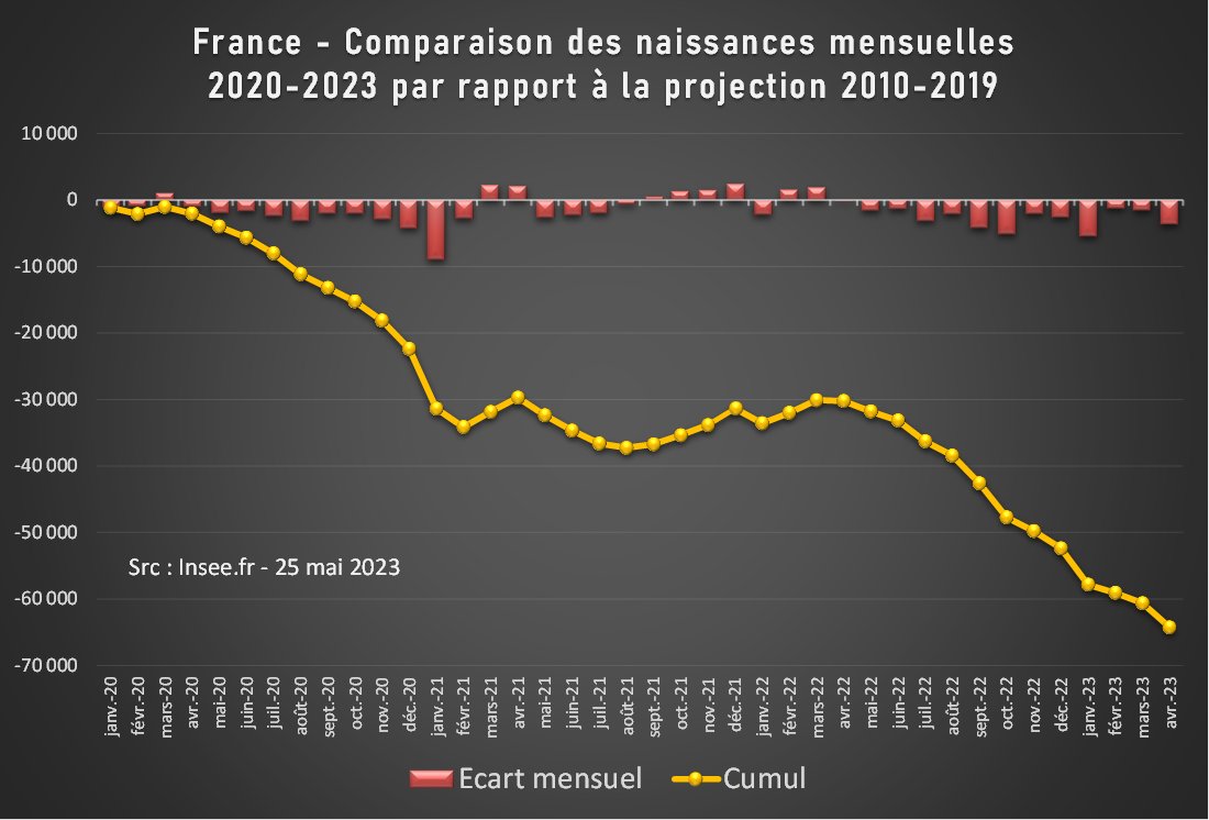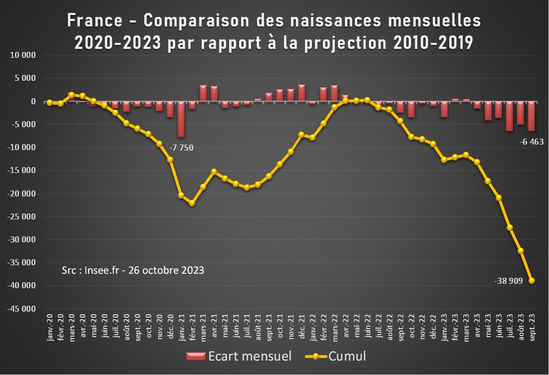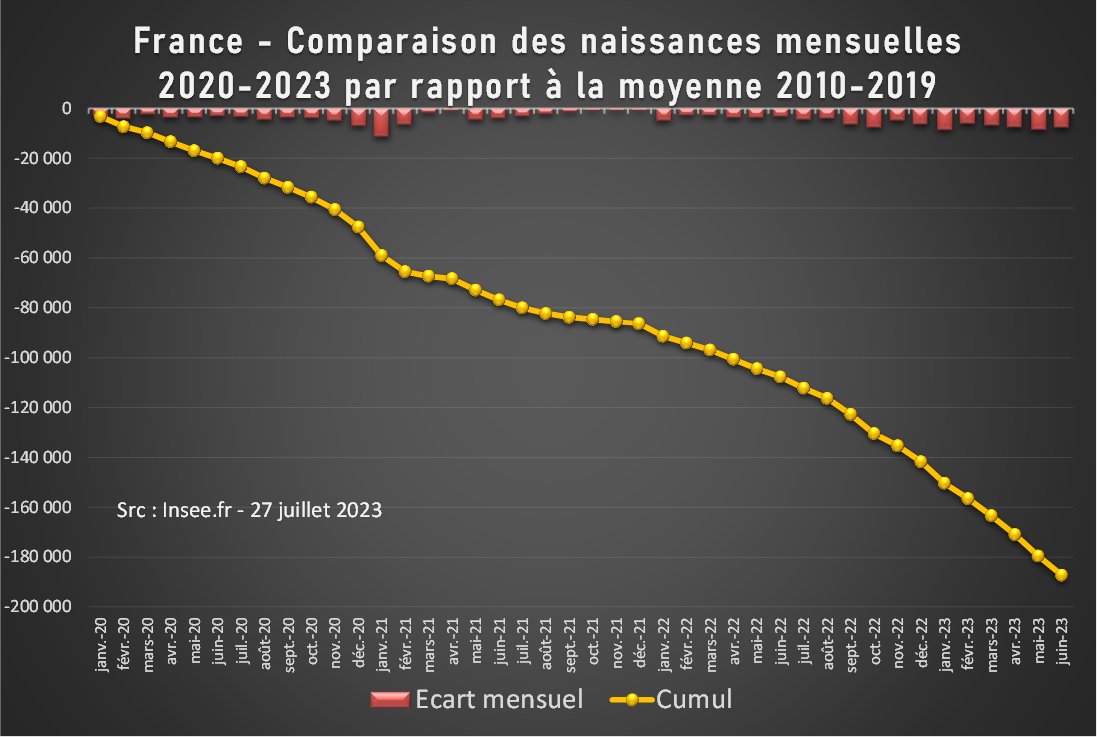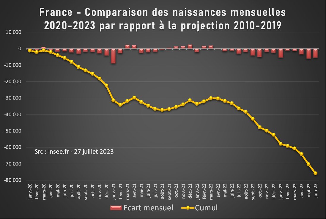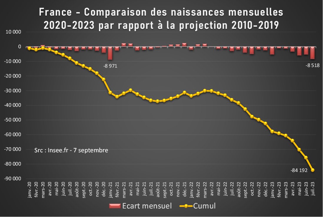 Et alors que ce déficit de 2020-2021 avait été complètement compensé par les bons chiffres de 2021-2022, de nouveaux déficits n'ont cessé de s'accumuler depuis septembre 2022. Ce sont maintenant plus de 100k naissances qui manquent, presque 2 mois complets de naissances. [2/4]