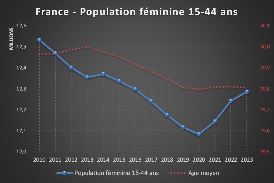 Et pourtant, toujours d'après l'INSEE, la population féminine 15-44 ans a augmenté d'environ 1,7% depuis son plus bas atteint en 2020 et a retrouvé le niveau de 2016 (mini baby boom). https://insee.fr/fr/outil-interactif/5014911/pyramide.htm#!& [4/4]