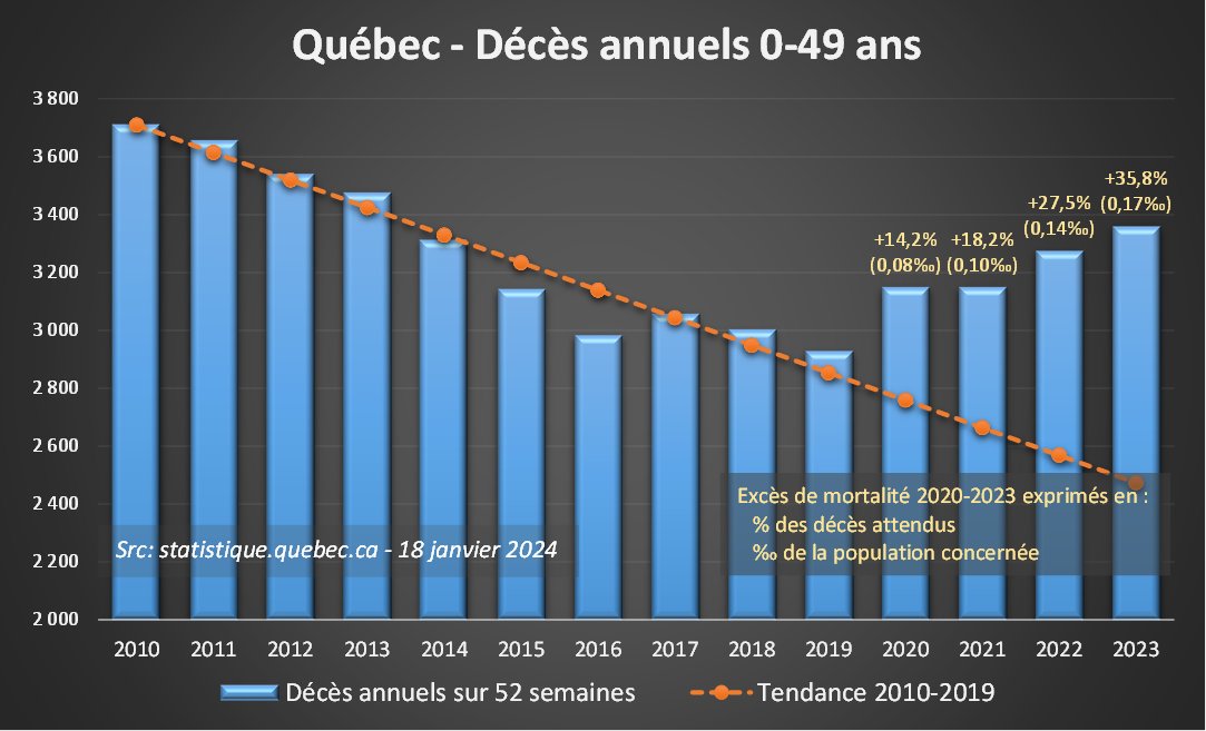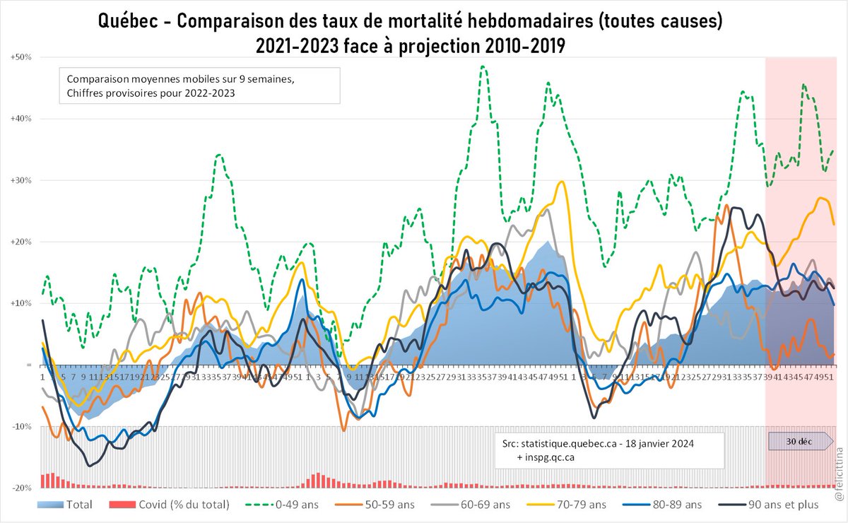 Mais cela devrait quand même commencer à être difficile d'assumer le "Vacciner aussi les plus jeunes, pour protéger les plus fragiles". https://ici.radio-canada.ca/nouvelle/1795747/campagne-vaccination-adolescents-quebec Parce que là on constate, en 2022-2023, plus de 1500 décès inattendus chez les 0-49 ans… [7/9]