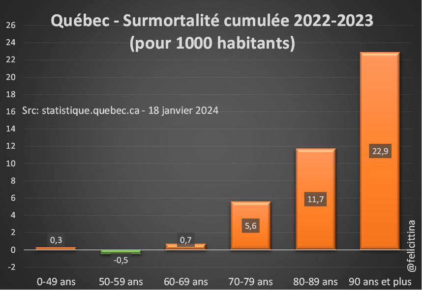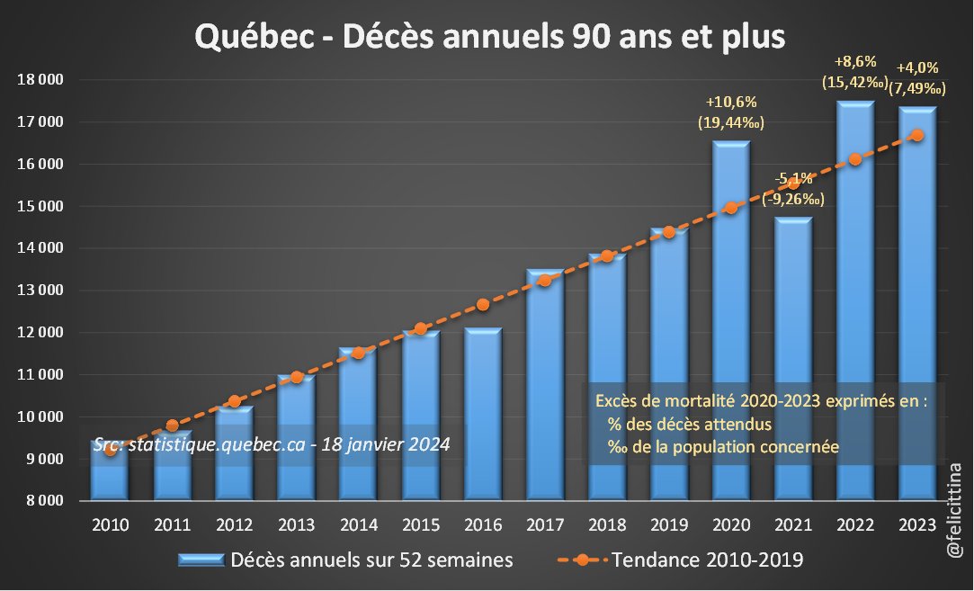 @GeneviveCaron18 @blais_gloriane @MakisMD @TheMarieOakes @LucieLaurier @EloVeut @HuffPostQuebec @CCCAlliance @DrNancyOlivieri @Mj_BlackBurn_ Mais regardez les chiffres exprimés en ‰ de la population. La déviation de +35,8% correspond à 0,17‰ de cette population (886/5,2M) Par contre, pour les 70-79 ans, la surmortalité (moindre en %) concerne 2,56‰ de la tranche (2k/811k), soit 15 fois +, en proportion. [2/9]