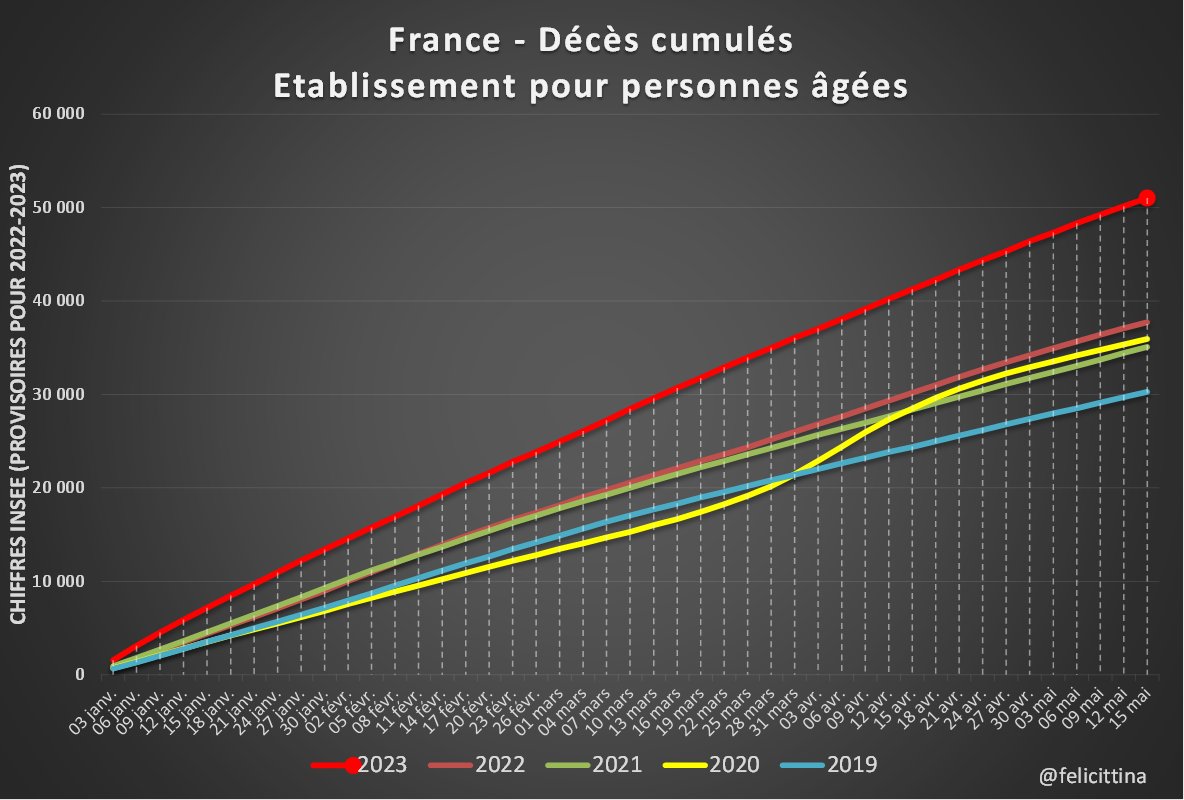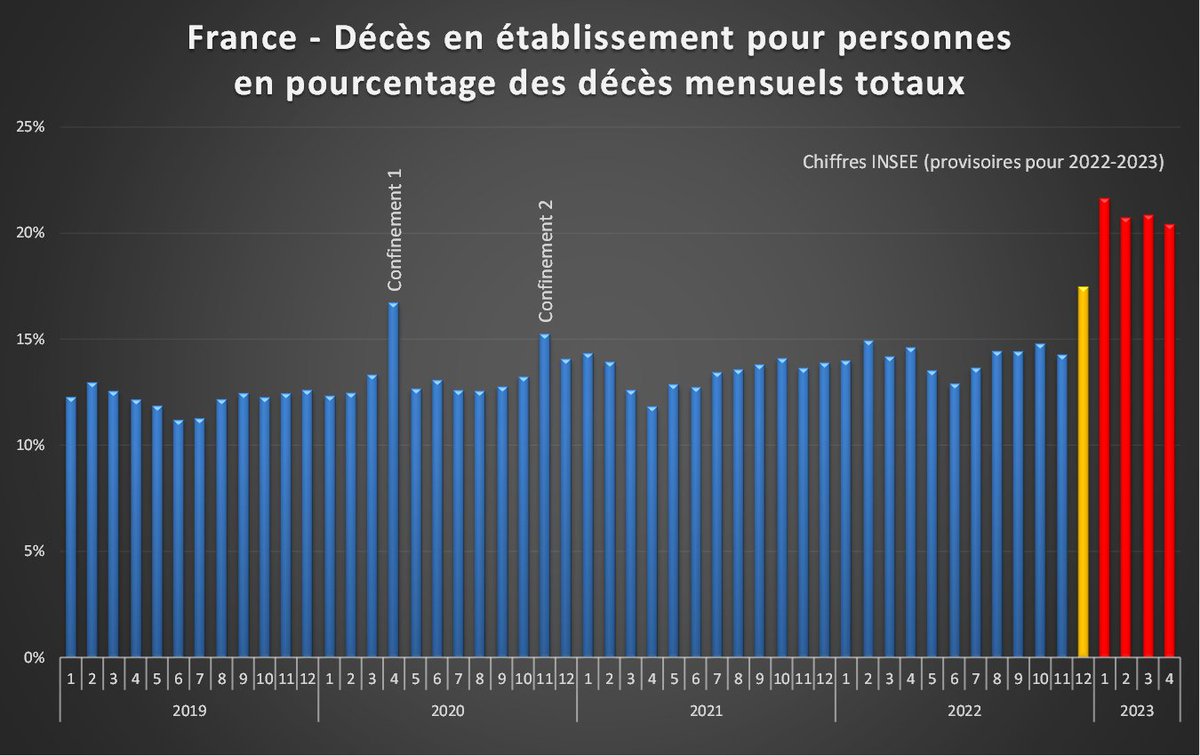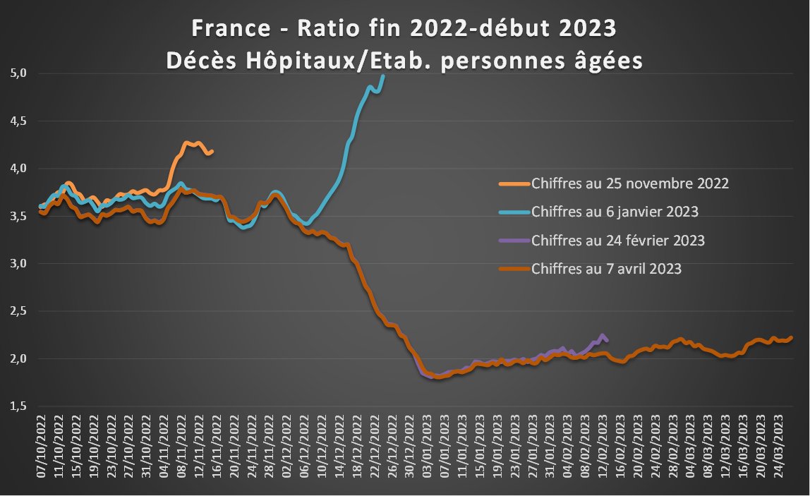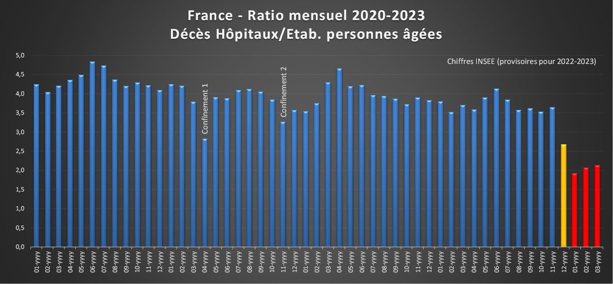 Complément : Avec les totaux mensuels on voit des chiffres anormalement élevés en décembre 2022 à la fois à l'hôpital et en EHPAD, puis ces chiffres rester très anormalement élevés en EHPAD alors qu'ils deviennent anormalement bas à l'hôpital. [5/4] https://t.co/8AosJzG8jb
