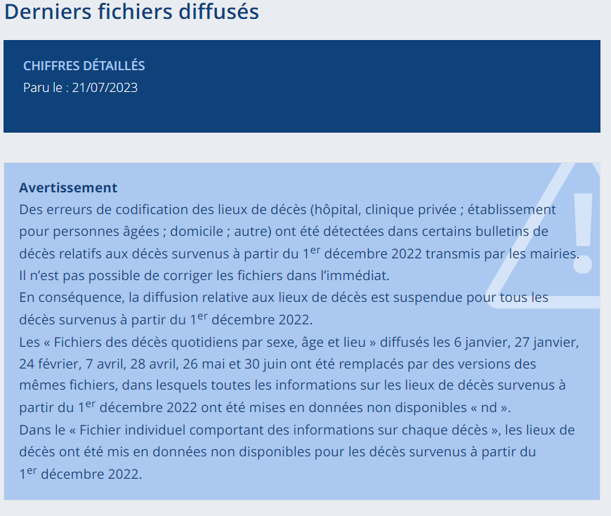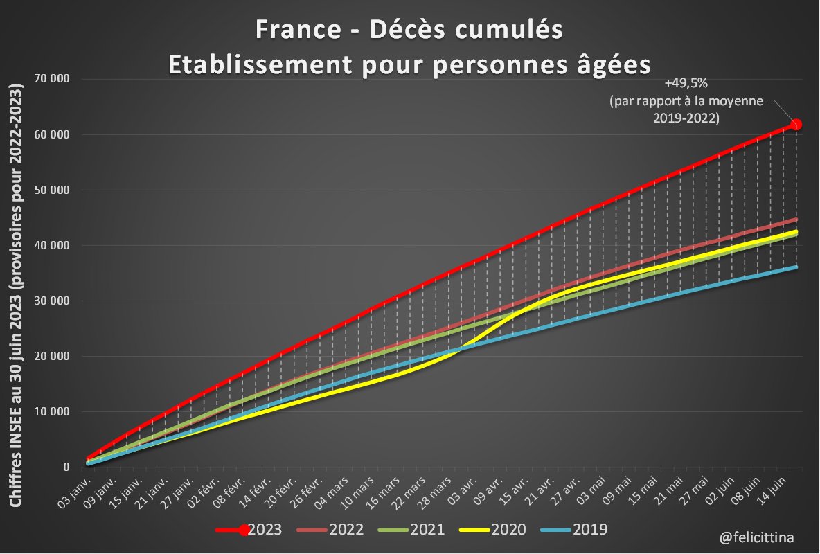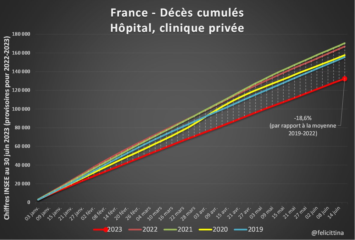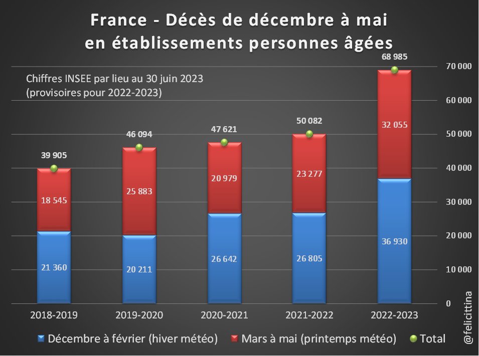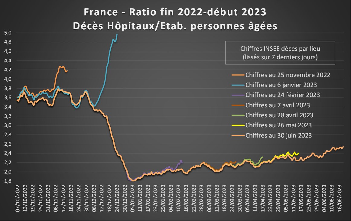Complément : Avec les totaux mensuels on voit des chiffres anormalement élevés en décembre 2022 à la fois à l'hôpital et en EHPAD, puis ces chiffres rester très anormalement élevés en EHPAD alors qu'ils deviennent anormalement bas à l'hôpital. [5/4] https://t.co/8AosJzG8jb