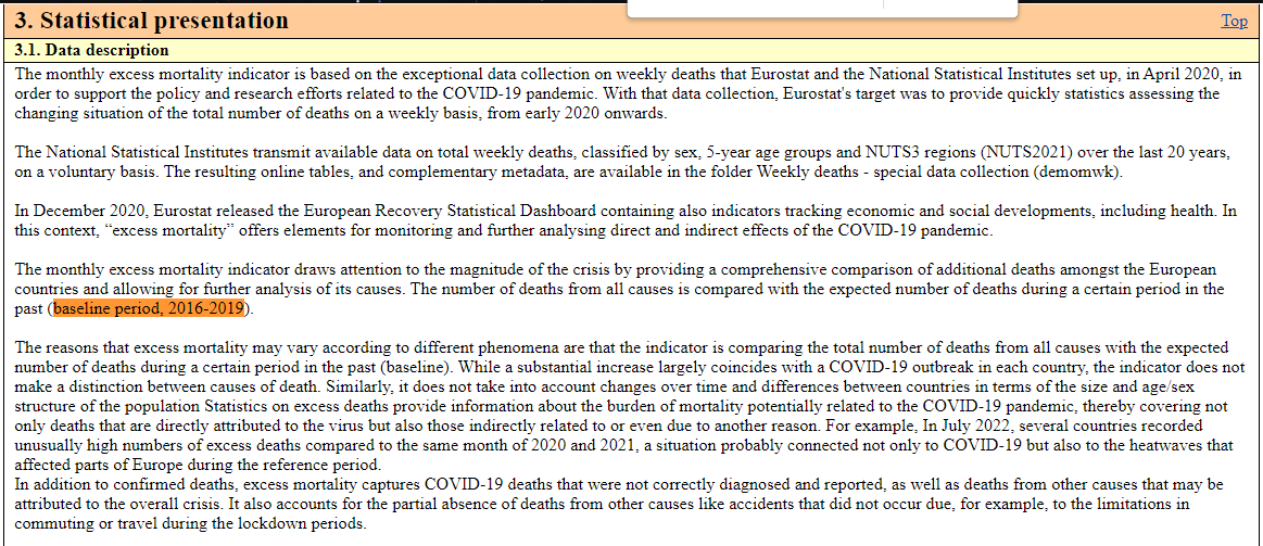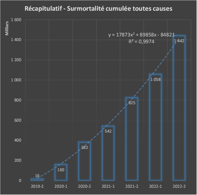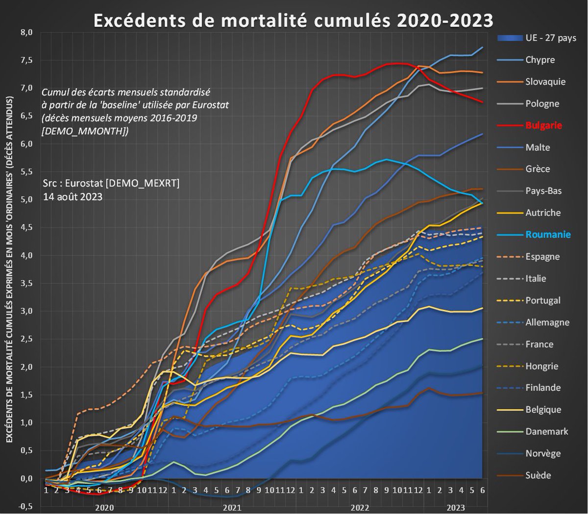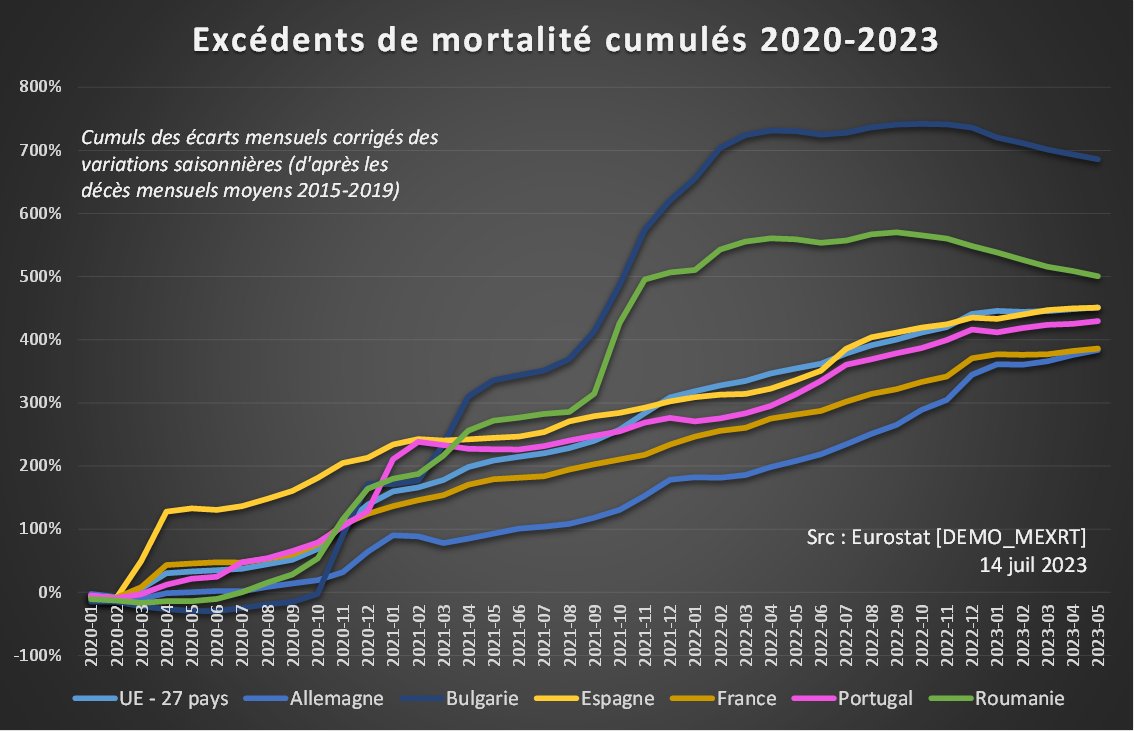 Ces taux de surmortalité mensuels sont facilement vérifiables sur : https://ec.europa.eu/eurostat/databrowser/view/DEMO_MEXRT__custom_3434113/bookmark/table?lang=fr&bookmarkId=05c46227-0aa8-4aaf-a632-e77a023cfa66 Les décès mensuels pour calculer les décès attendus et obtenir un cumul fiable sont disponibles là : https://ec.europa.eu/eurostat/databrowser/bookmark/d9d3eab5-6605-446c-b1ec-76d5631c4916?lang=fr&page=time:2022