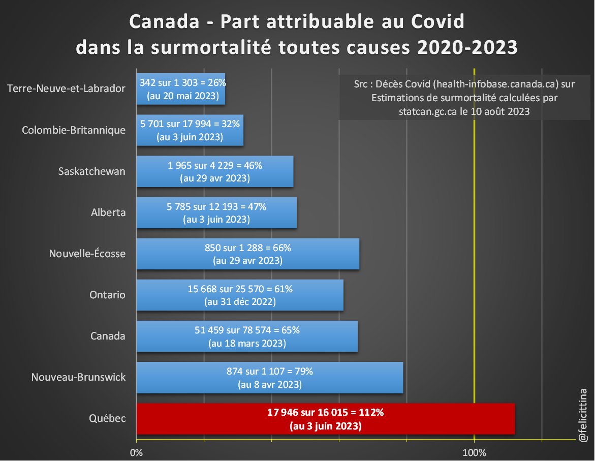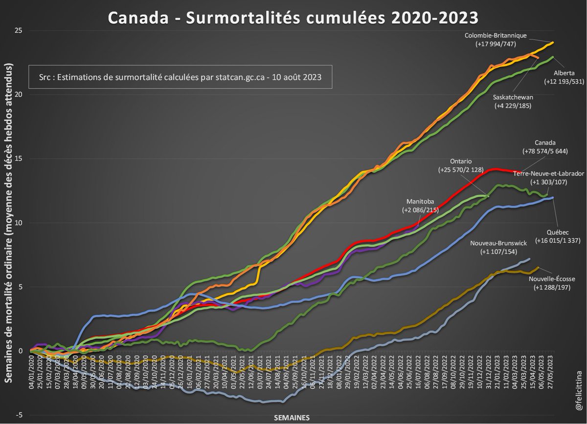 Seul Terre-Neuve-et-Labrador est parvenu ces dernières semaines à grignoter 5% de son cumul mais a déjà repris 1% sur la seule dernière semaine. Bizarrement, c'est la province qui a le moins "chargé" le Covid pour expliquer sa surmortalité (26% contre 112% pour le Québec !) [4/5] https://t.co/sUIfaTJGth