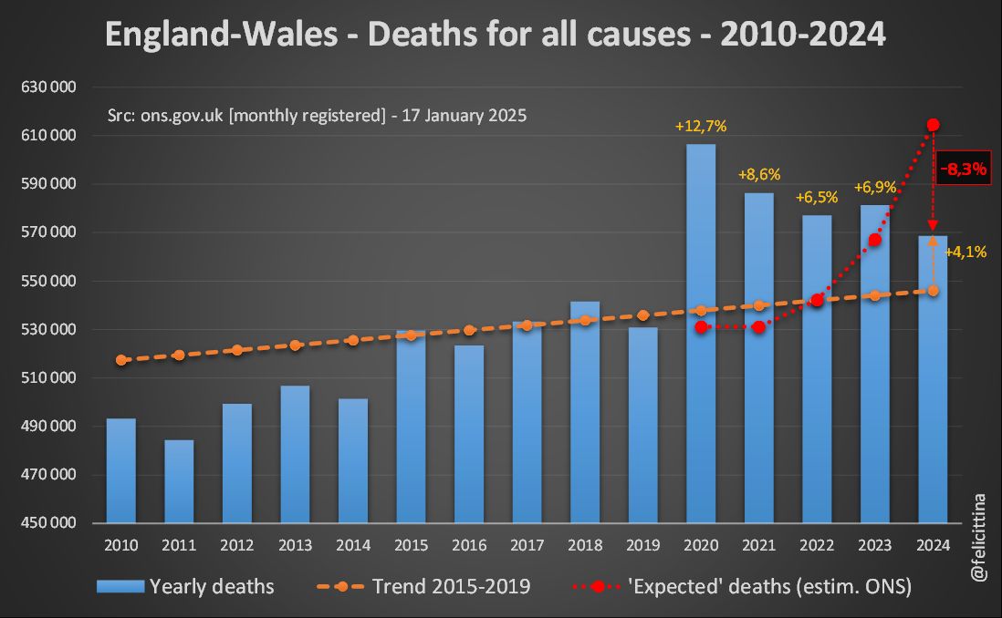 Et ces décès COVID ne représentaient qu'un tiers de la surmortalité toutes causes qui a rejoint, en quelques mois, celle observée depuis 3 ans en Occident, et qui ne faiblit pas depuis la "protection" ARNm. [13/15]