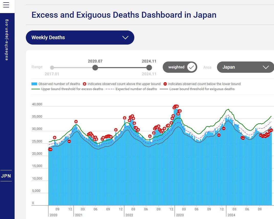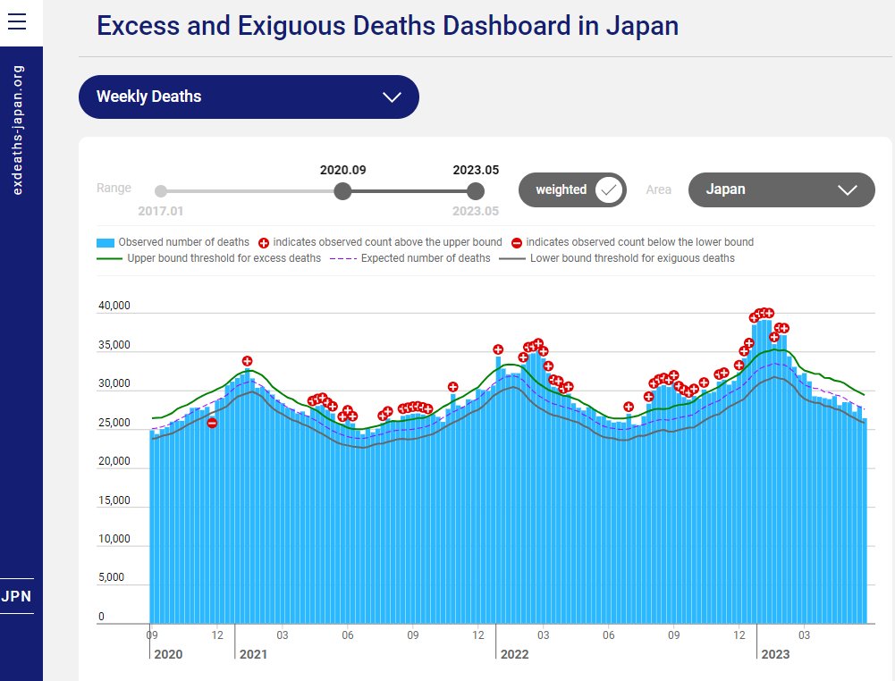 2. Et effectivement, quand vous regardez le résultat de leurs calculs depuis mars 2023, vous constatez que la plupart des barres🟦, montrant les décès observés, restent bien en dessous de la ligne tiretée, montrant les décès "attendus". https://exdeaths-japan.org/en/graph/weekly/
