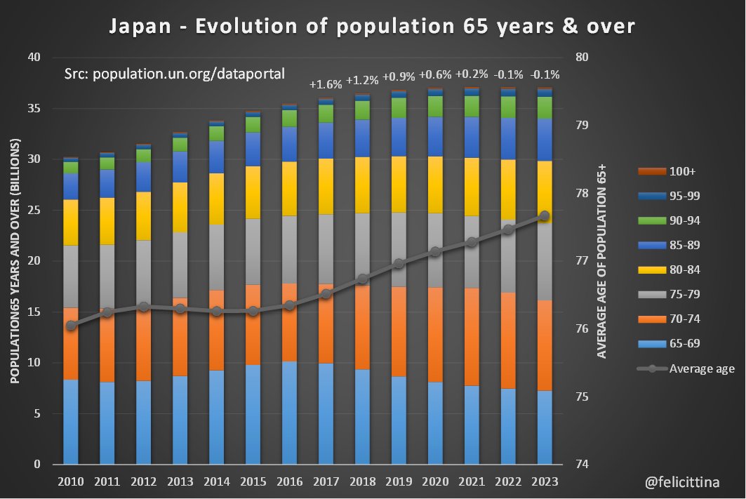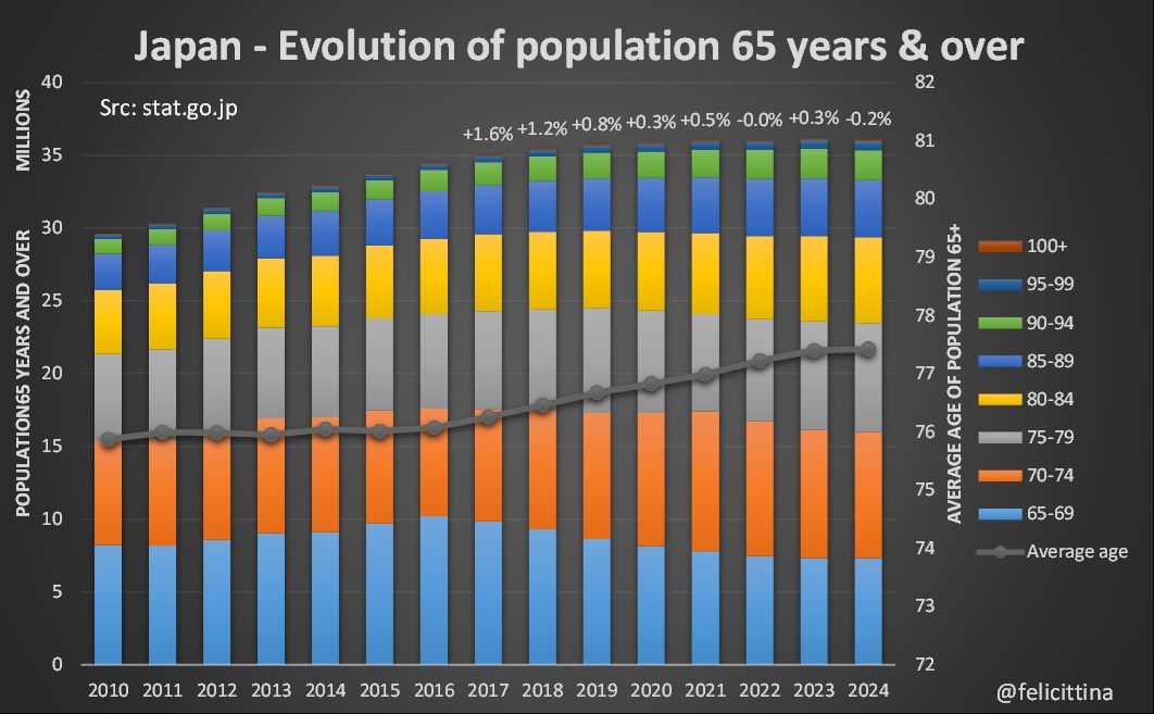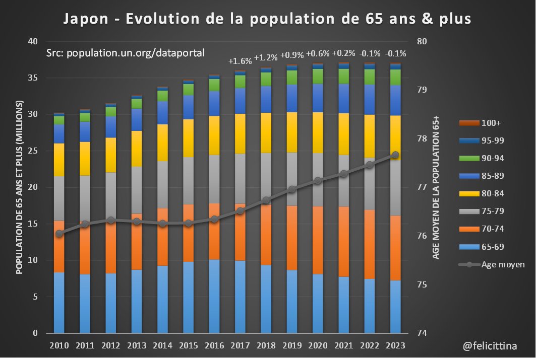 5. Le Japon est en fait l'un des seuls, voire le seul pays à connaître une telle stagnation de sa population âgée. [Pour collecter ces données, j'ai dû fouiller dans plusieurs fichiers et certaines valeurs sont arrondies, si vous trouvez un récap + complet, faites-moi savoir]