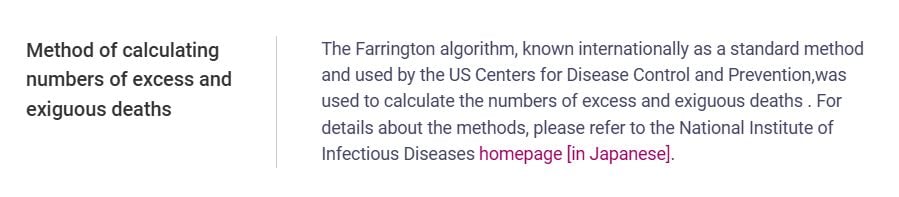 @MHLWitter 7. The method used to calculate such implausible death predictions refers evasively to a ‘Farrington algorithm’. But the referenced page dates from... July 2020 and concerned the analysis of deaths up to April 2020. https://exdeaths-japan.org/en/#method