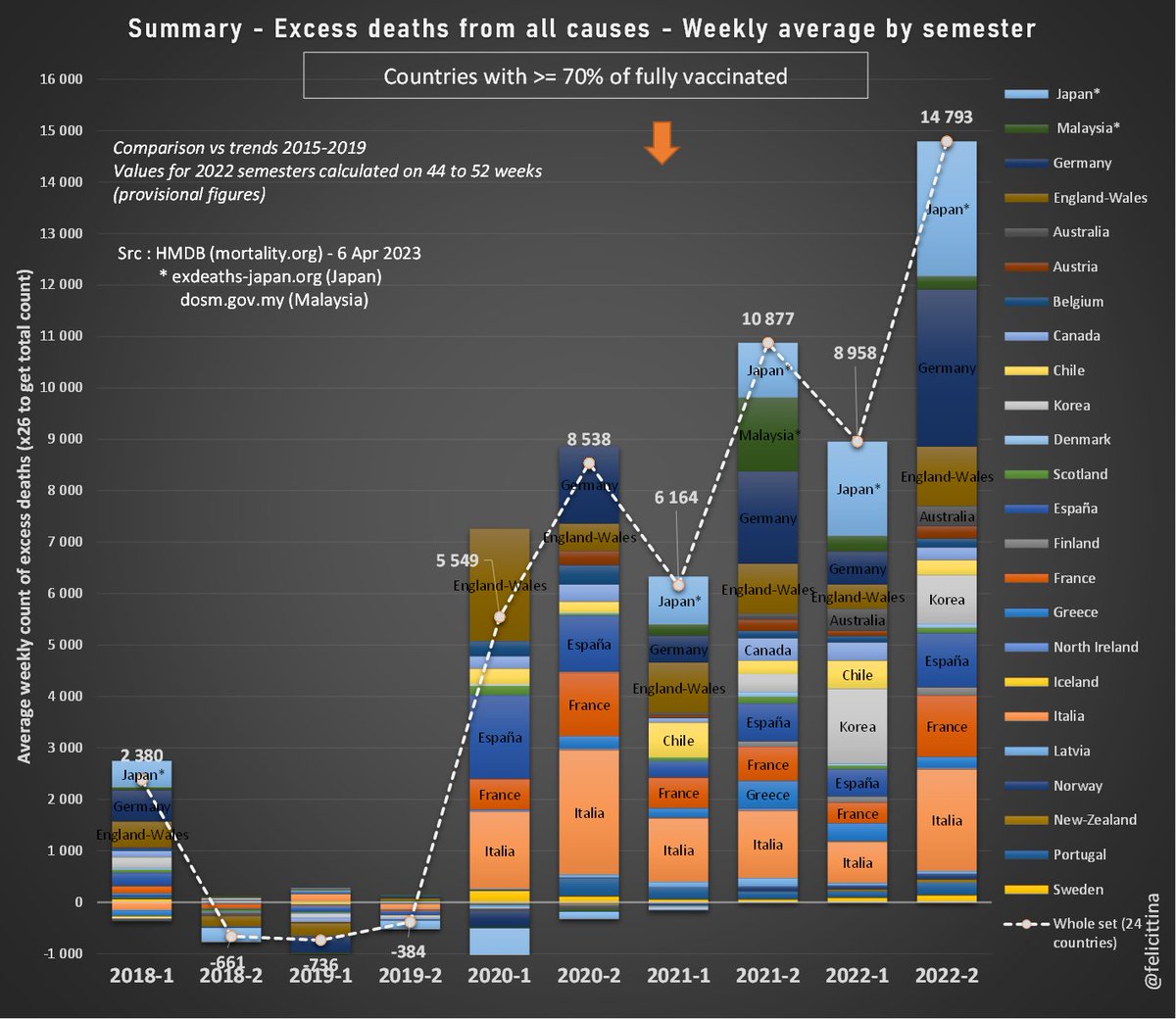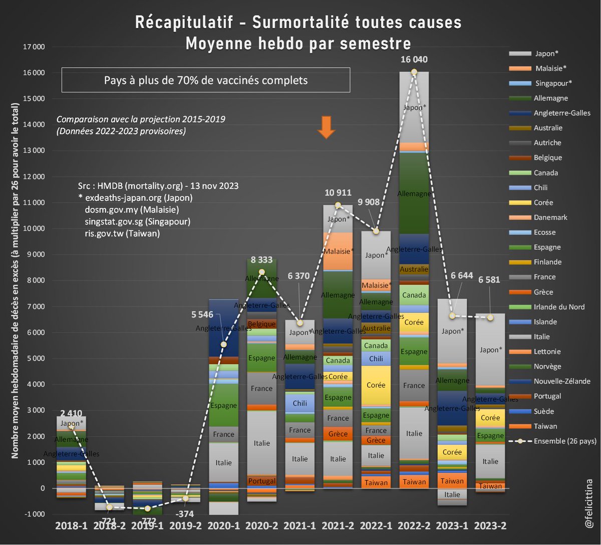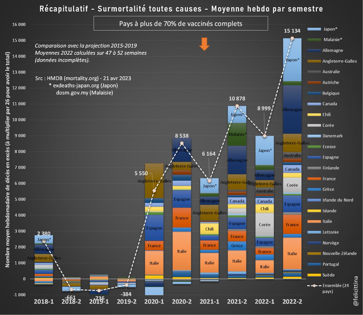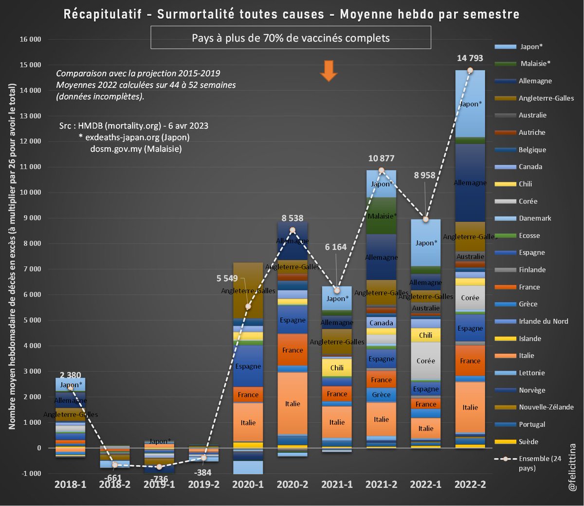@felicittina @EU_Eurostat Ok, quand je dis 55 000 morts de trop en 2022 par rapport à la moyenne SANS tenir compte de l'effet moisson AVEC l'effet moisson c'est plus de 80 000 morts inexpliquées de trop en 2022 après 150 millions de doses de "vaccins" Ces pseudo vaccins TUENT !