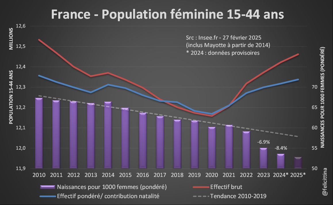 Or, la population des JF a connu une évolution défavorable entre 2010 et 2020, mais bien meilleure depuis 2021 grâce au mini baby boom (à partir de 1995). Ainsi, en 2025, on retrouve des effectifs quasi-similaires à ceux de 2010, mais avec 20% de naissances en moins [3/4]