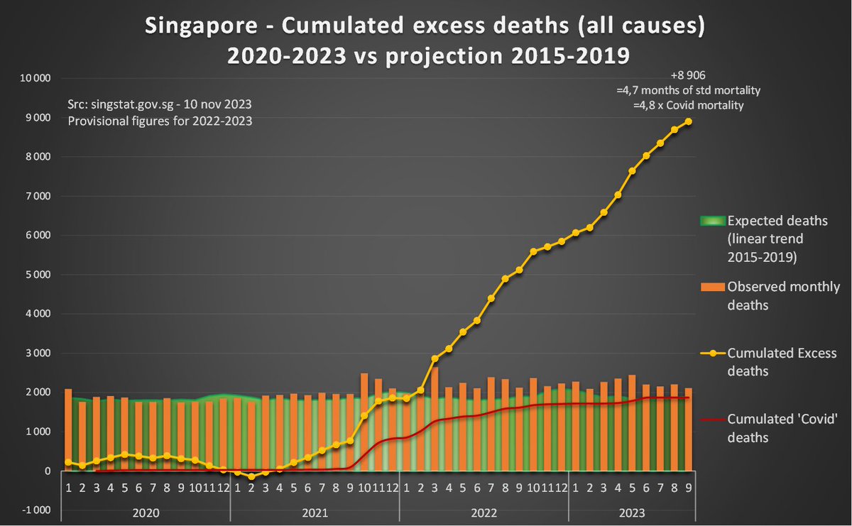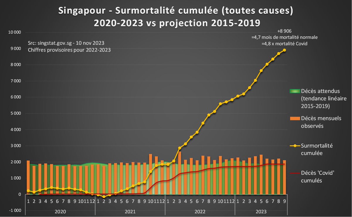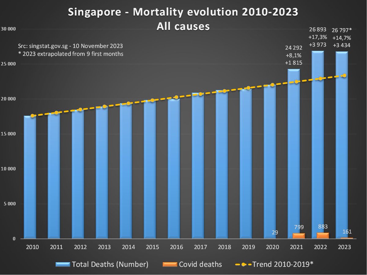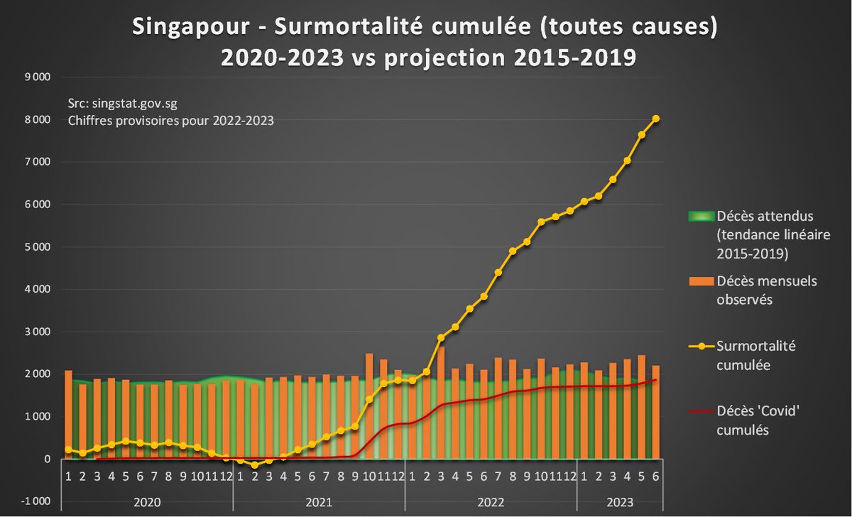 en 2 ans (+17% en moyenne). Les décès attribués au Covid ne représentent qu'un quart de cette surmortalité. Sources : Chiffres mensuels (jusqu'en mars) : https://tablebuilder.singstat.gov.sg/table/TS/M810121 Chiffres dernier trimestre : https://www.ica.gov.sg/news-and-publications/statistics