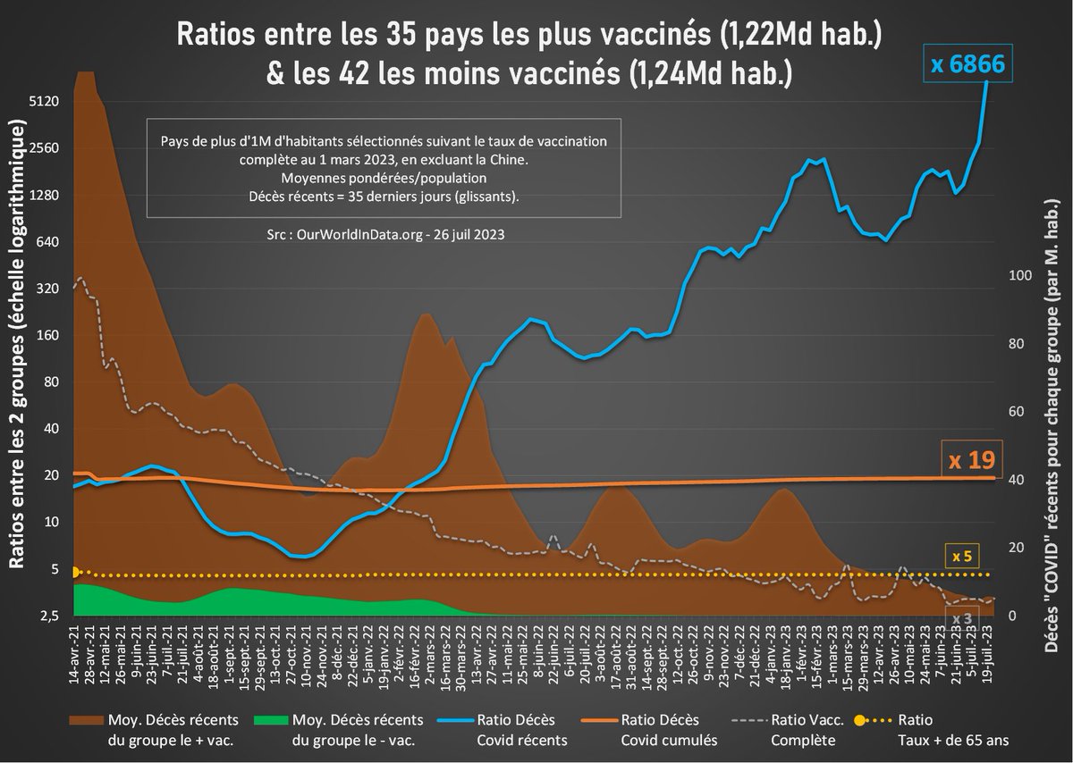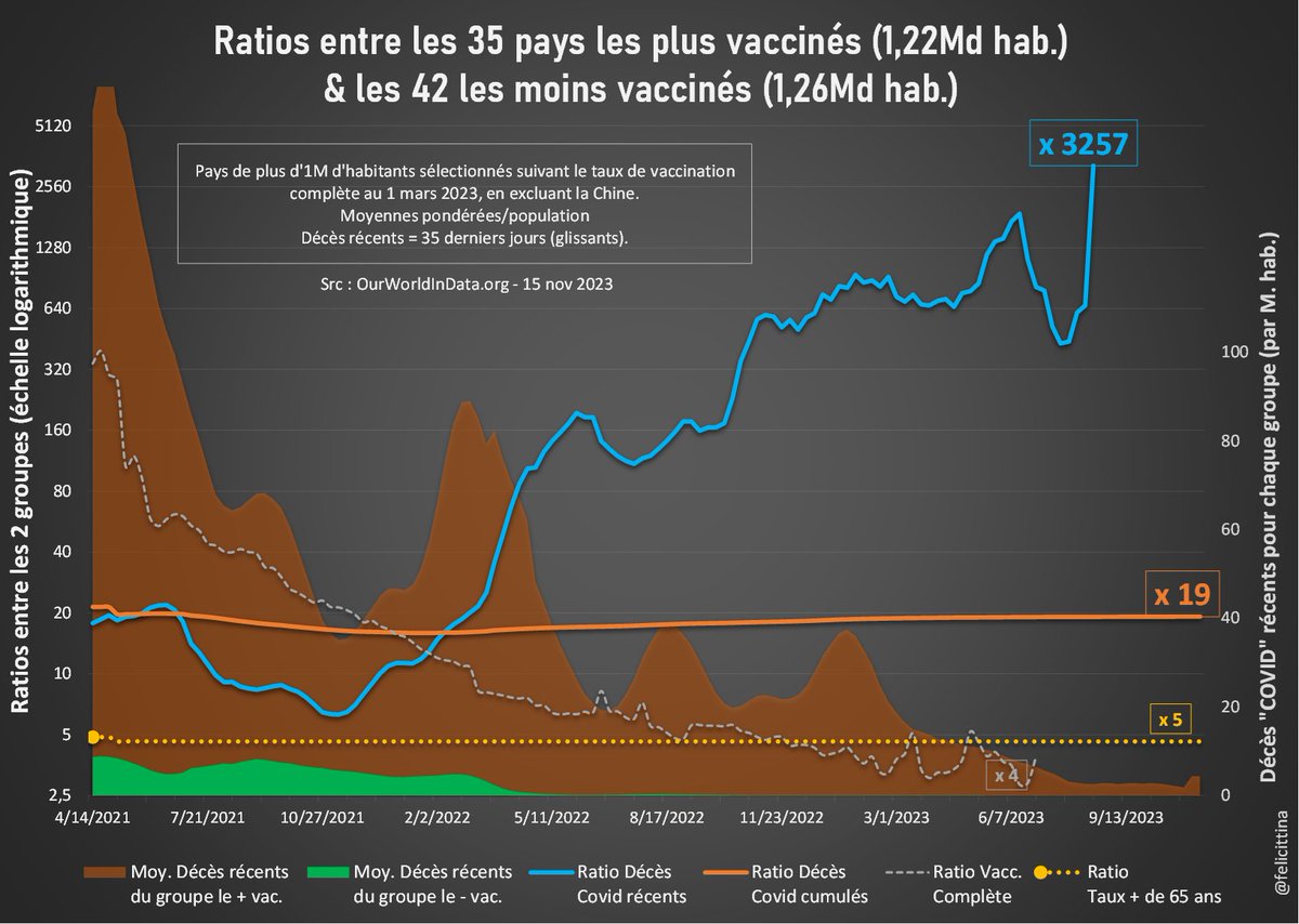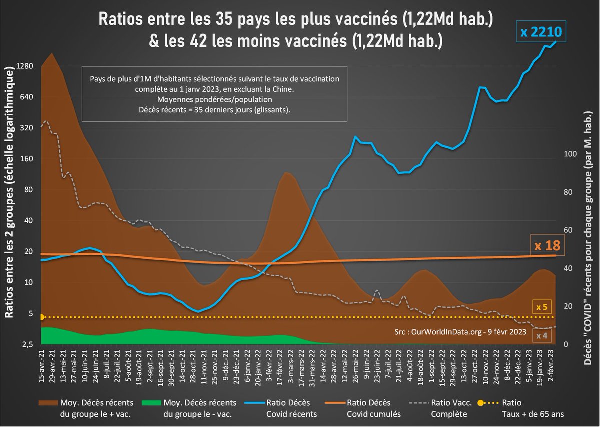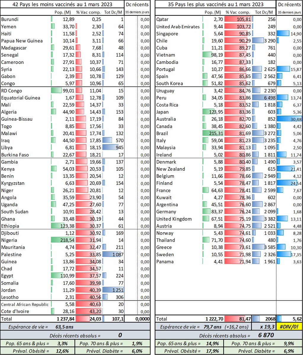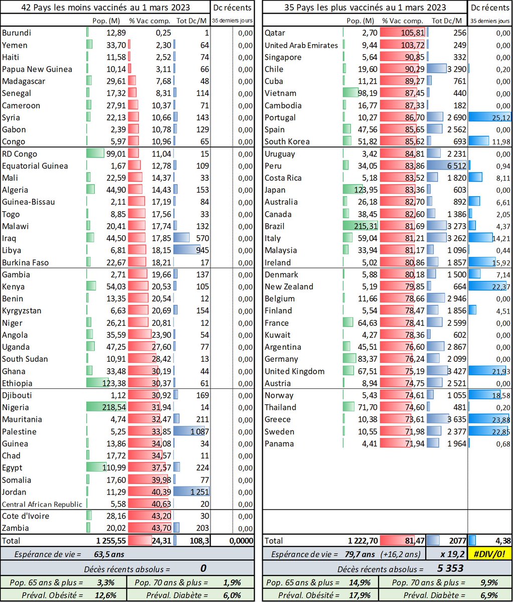 Ça y est… impossible de calculer le ratio entre les décès "Covid" des 35 pays les + vaccinés et les 42 pays les - vaccinés (1,2 Md habitants pour chq groupe). Puisque 0 décès a été attribué au Covid dans le 2d groupe dans les 5 dernières semaines. …/…
