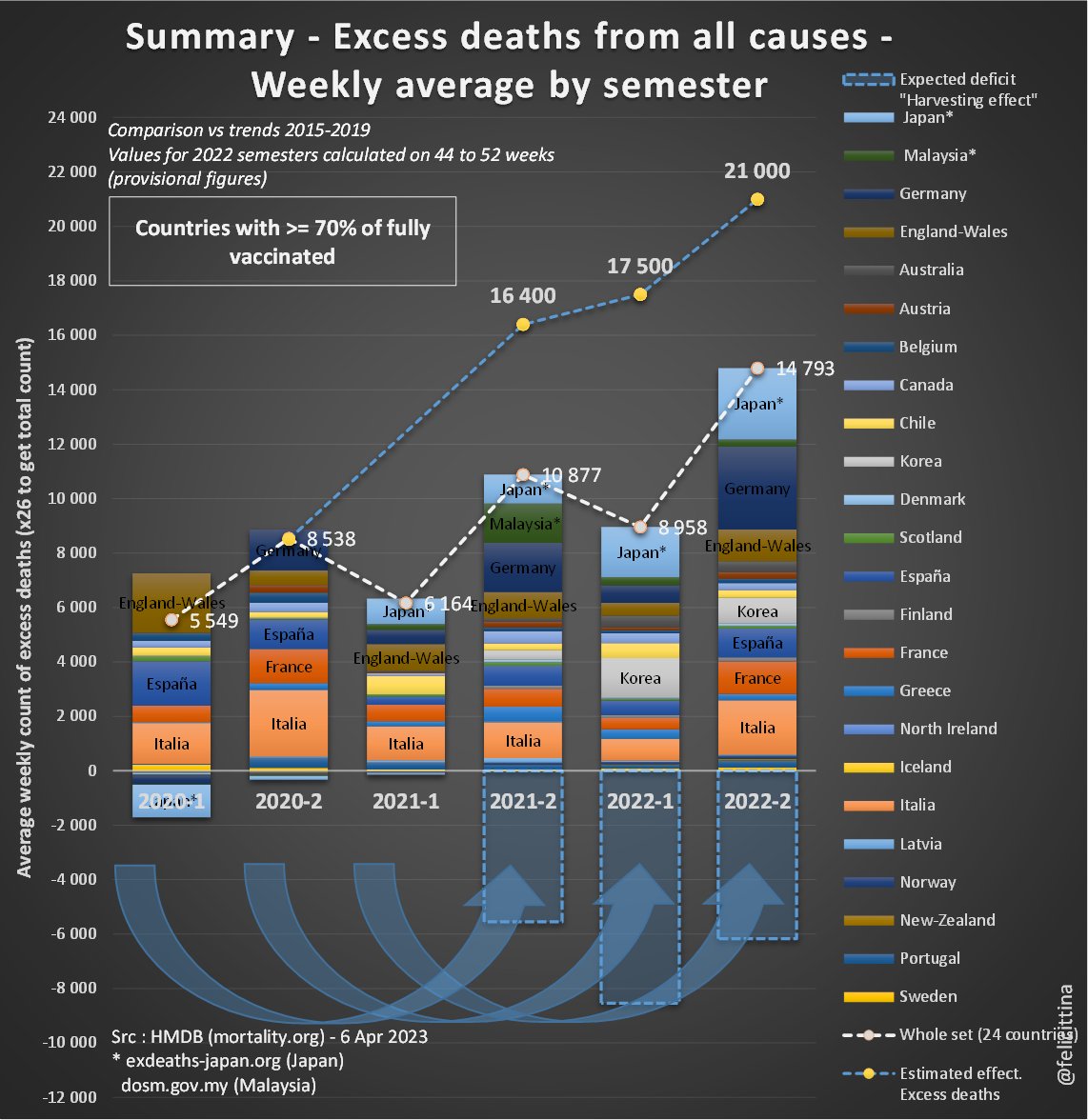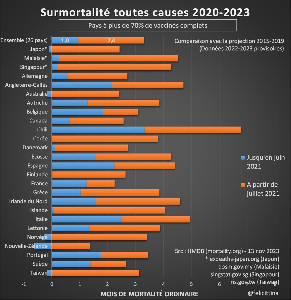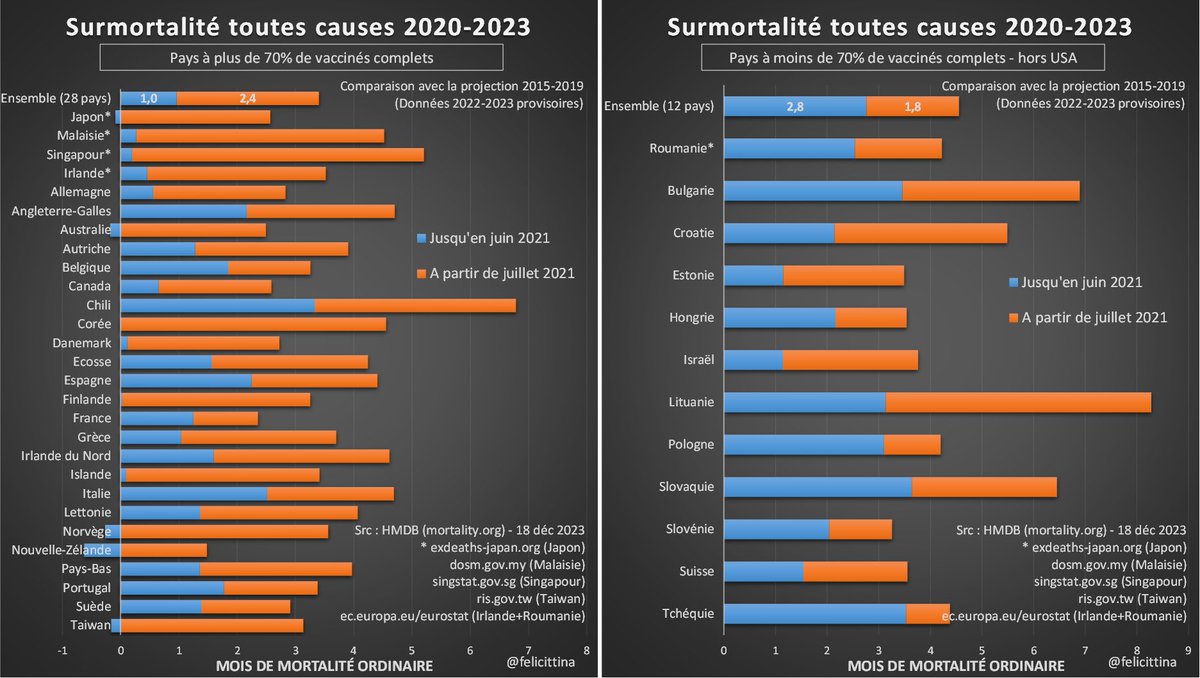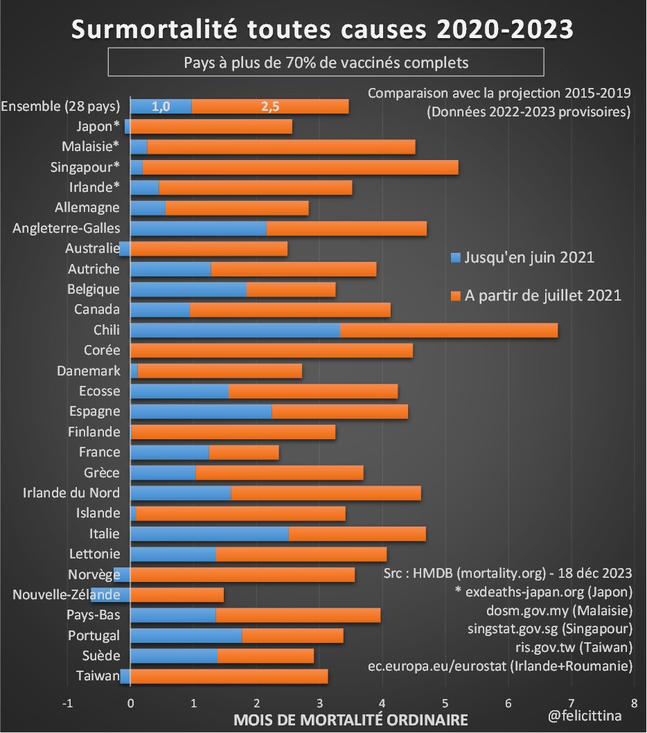 En un peu plus de 2 ans, ces décès excédentaires atteignent l'équivalent de 4,4 mois de mortalité ordinaire. Cela place le pays dans le peloton de tête, à la fois en terme de vacc° et de surmortalité. [3/5]