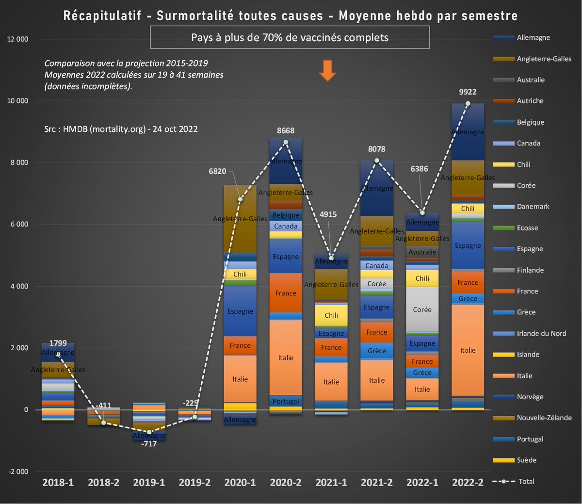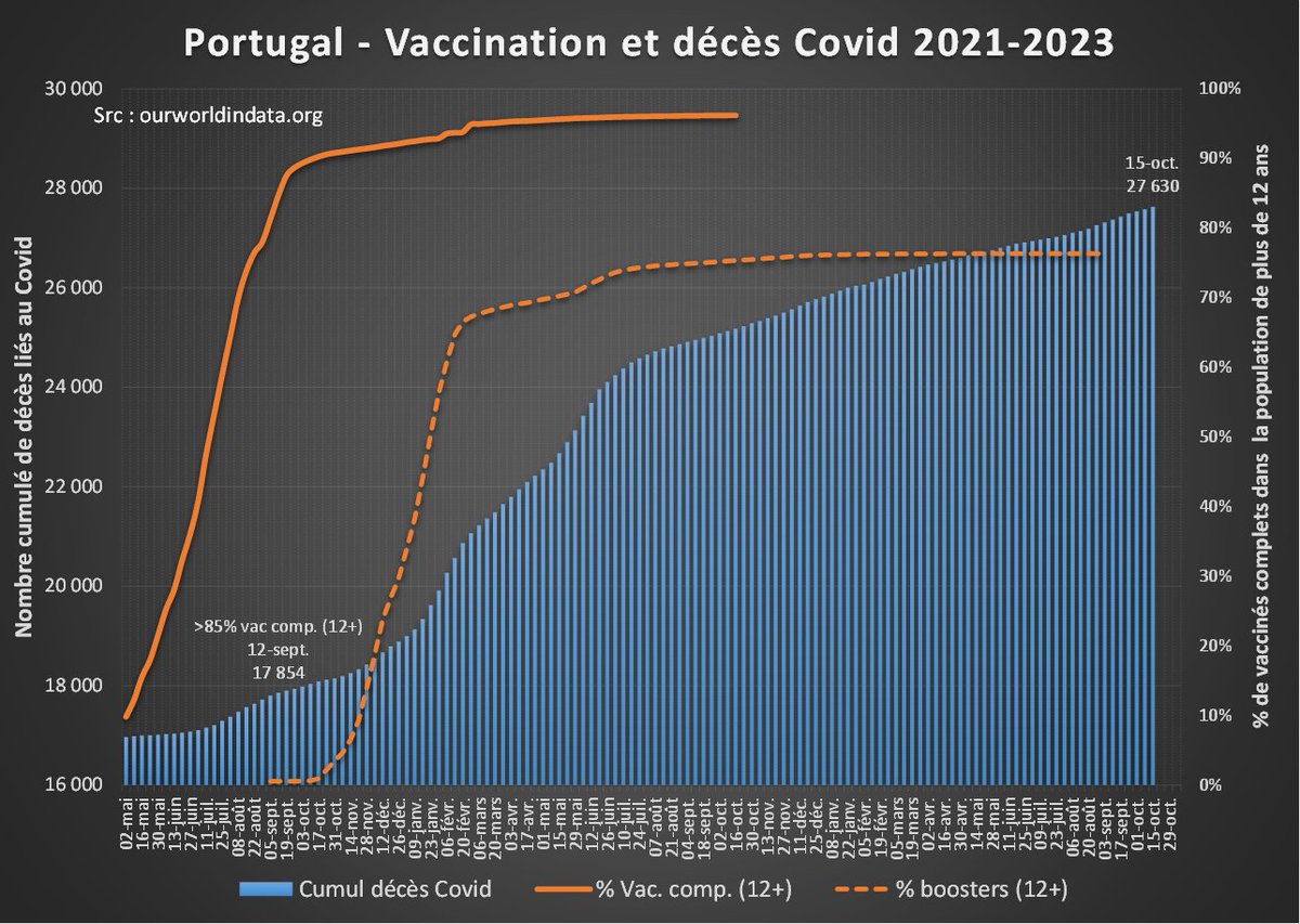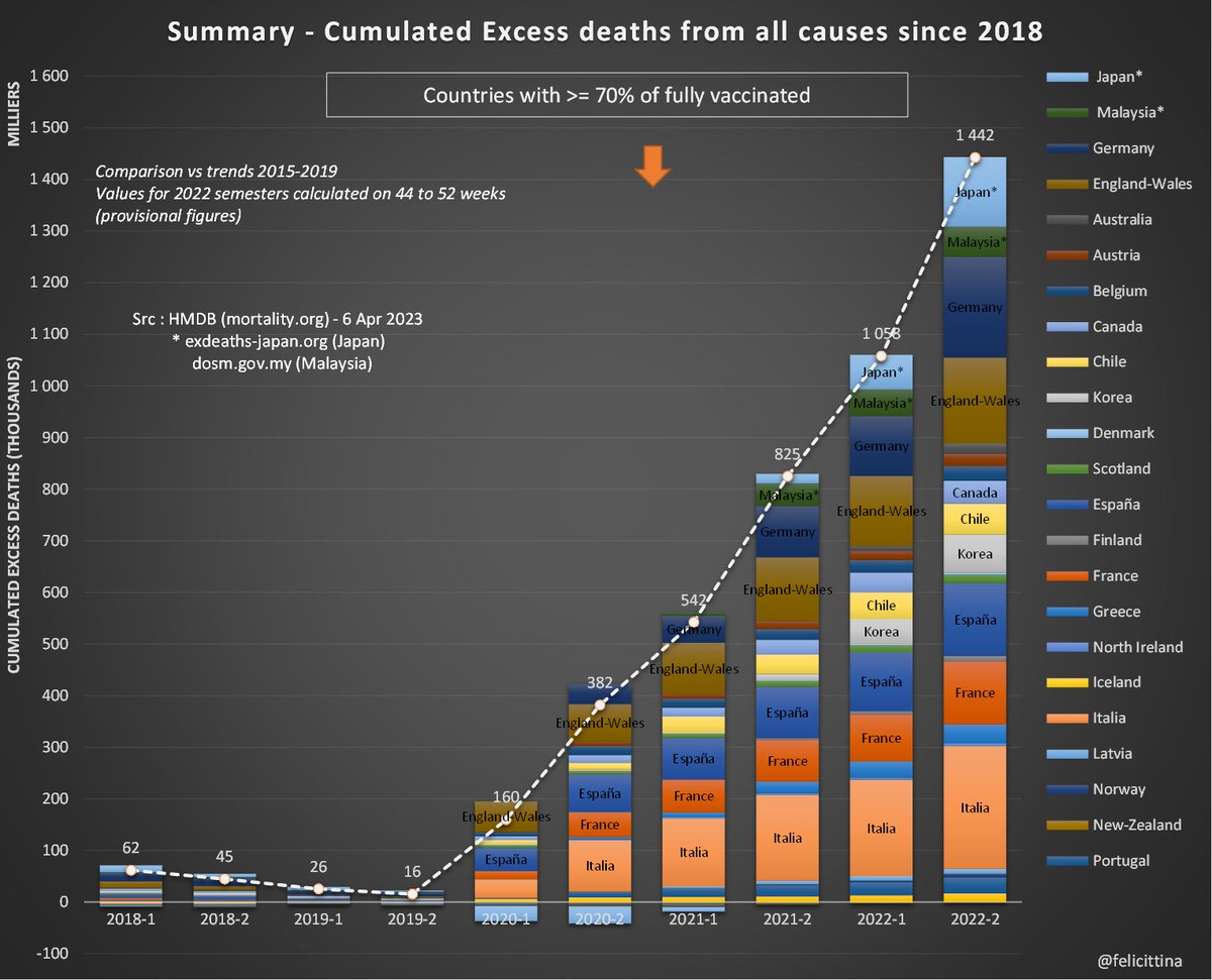 En un peu plus de 2 ans, ces décès excédentaires atteignent l'équivalent de 4,4 mois de mortalité ordinaire. Cela place le pays dans le peloton de tête, à la fois en terme de vacc° et de surmortalité. [3/5]