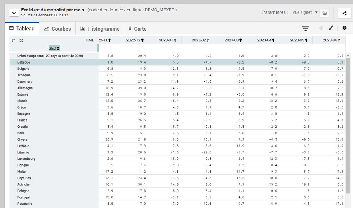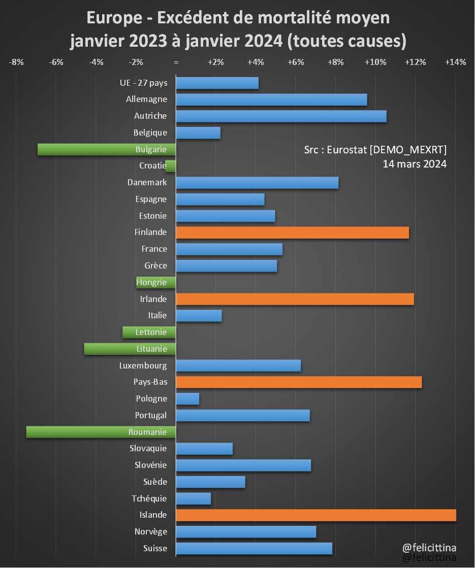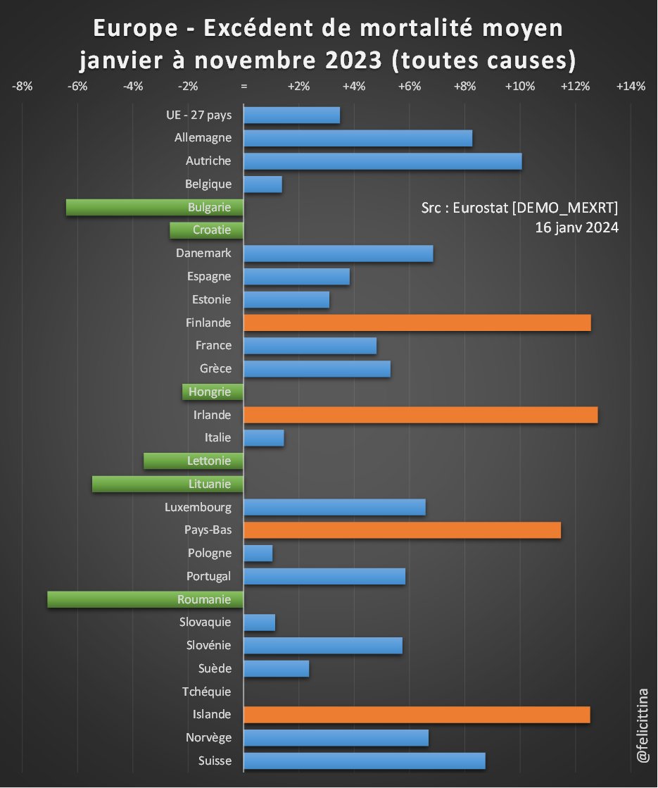 @aileastick1 @BarneriasPierre @Poulin2012 @francoisedegois @VeriteDiffusee @Cheikh_Redac @XavierBazin2 @CStrateges @MichelJeanDomi1 @InvestigAction D'autres statistiques du même Eurostat calculent directement les surmortalités. Regardez les 4 pays 🟧 autour de +12% depuis le début de l'année👀 Préciséement le top 4 du classement précédent. C'est ballot 😩 https://ec.europa.eu/eurostat/databrowser/view/DEMO_MEXRT__custom_3434113/bookmark/table?lang=fr&bookmarkId=05c46227-0aa8-4aaf-a632-e77a023cfa66