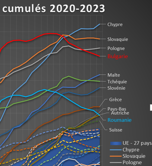 Il s'agit bien sûr de chiffres ponctuels mais si on fait un bilan cumulé, on assiste à un étrange regroupement. La Roumanie a presque rejoint le peloton des bons élèves. La Bulgarie a encore du chemin mais l'écart s'est réduit de moitié sur les 12 derniers mois. https://t.co/cUgg7qJq40
