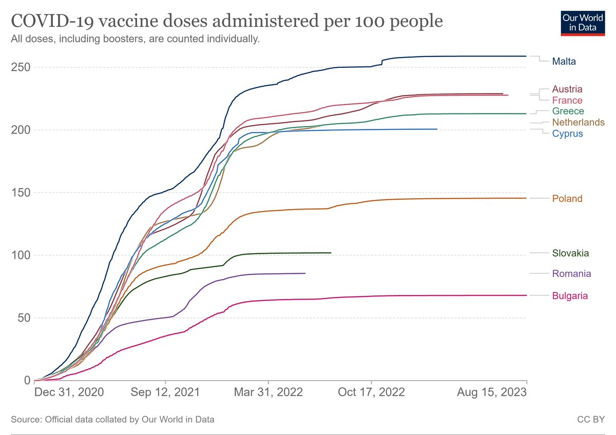 Complément : Doses administrées pour 100 habitants, pour les pays cités. https://ourworldindata.org/explorers/coronavirus-data-explorer?zoomToSelection=true&time=2020-12-31..latest&facet=none&country=FRA~CYP~SVK~POL~BGR~MLT~GRC~NLD~AUT~ROU&pickerSort=asc&pickerMetric=location&hideControls=true&Metric=Vaccine+doses&Interval=Cumulative&Relative+to+Population=true&Color+by+test+positivity=false @OurWorldInData fait ses mises à jour à l'économie. L'OMS a des chiffres + récents pour la Slovaquie qui la placerait un peu au dessous la Pologne, le double de la Bulgarie.
