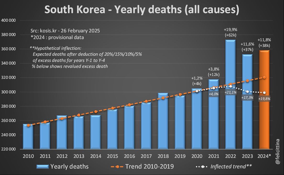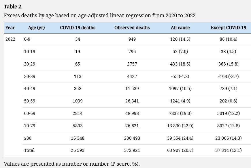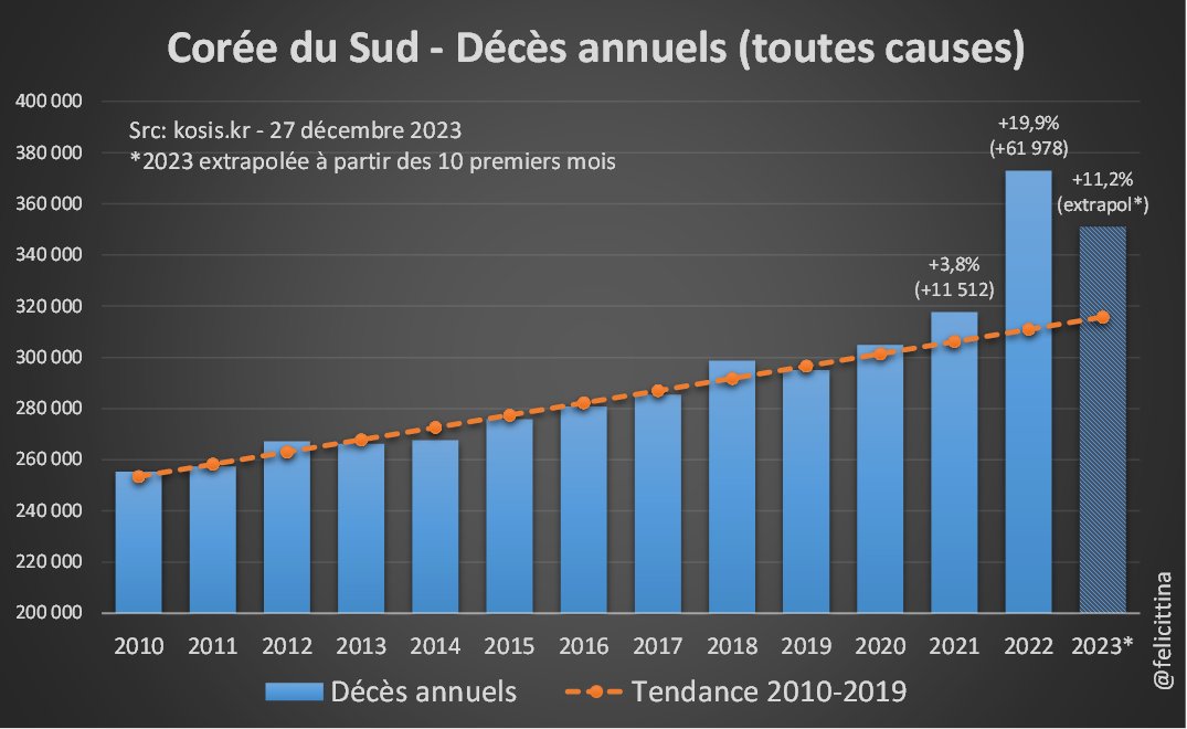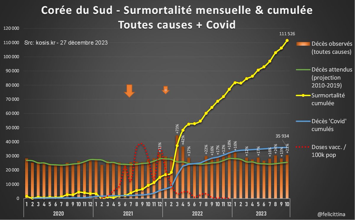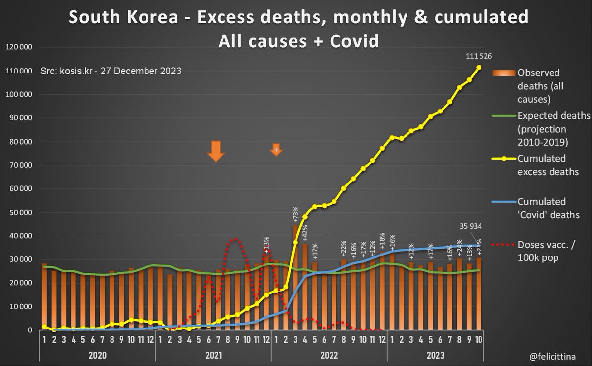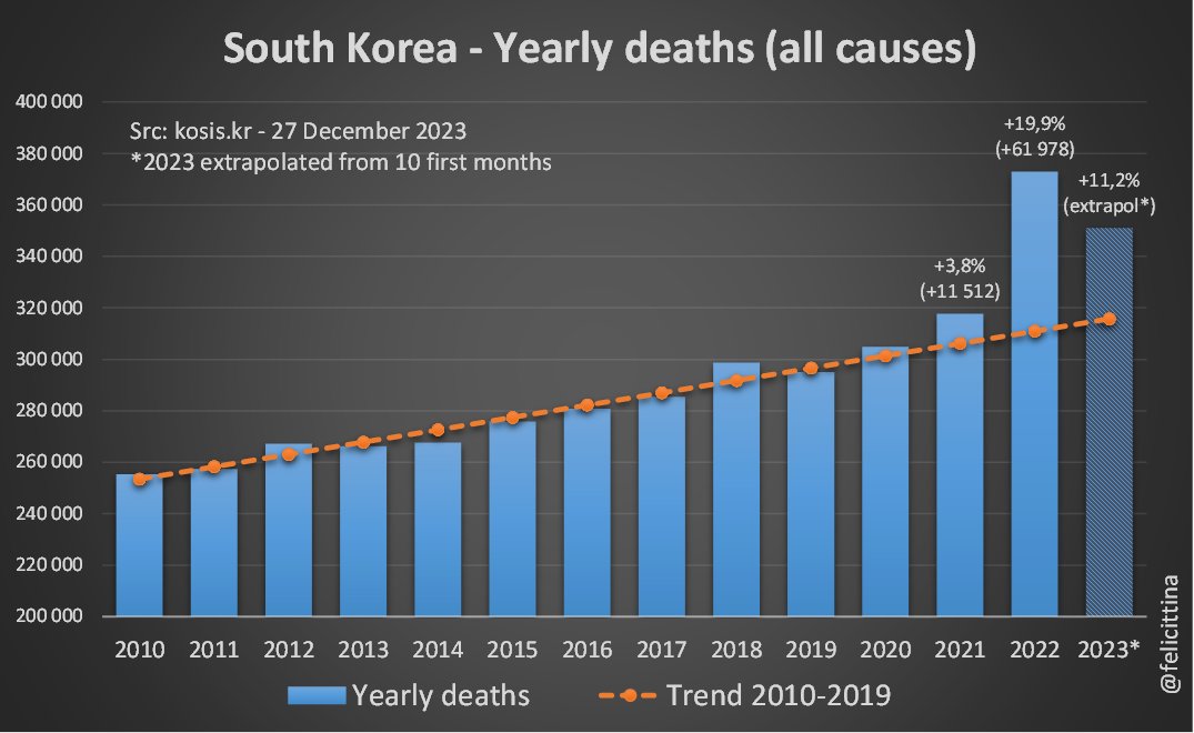 Les seules analyses de surmortalité que j'ai trouvées pour la Corée semblent s'être arrêtées à 2022. Elles sont même un peu + pessimistes que moi en trouvant des surmortalités supérieures à +20% pour 2022. Cette étude a été publiée sur le JPMPH https://www.jpmph.org/journal/view.php?number=2386 [4/7]