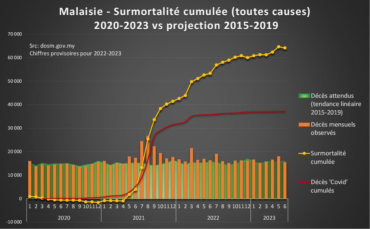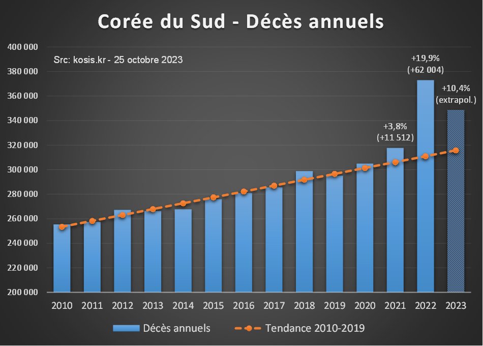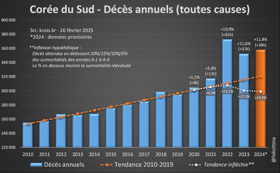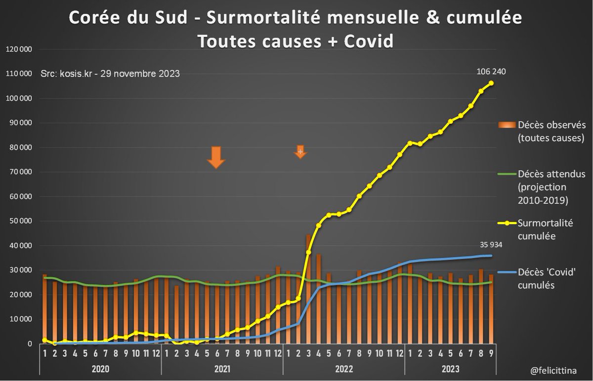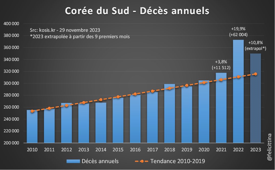 Les seules analyses de surmortalité que j'ai trouvées pour la Corée semblent s'être arrêtées à 2022. Elles sont même un peu + pessimistes que moi en trouvant des surmortalités supérieures à +20% pour 2022. Cette étude a été publiée sur le JPMPH https://www.jpmph.org/journal/view.php?number=2386 [4/7]