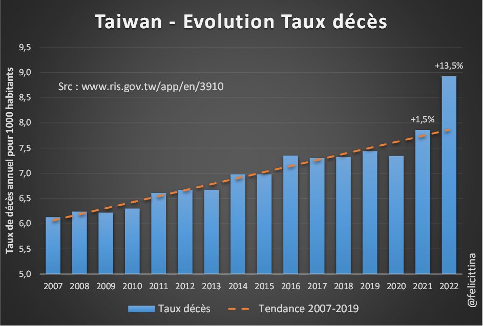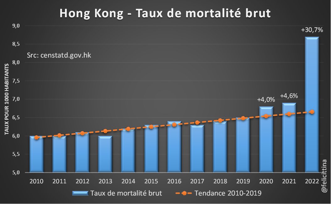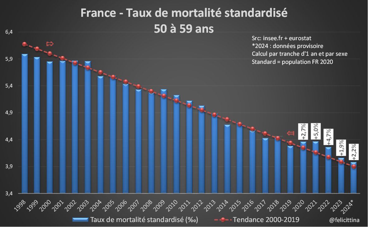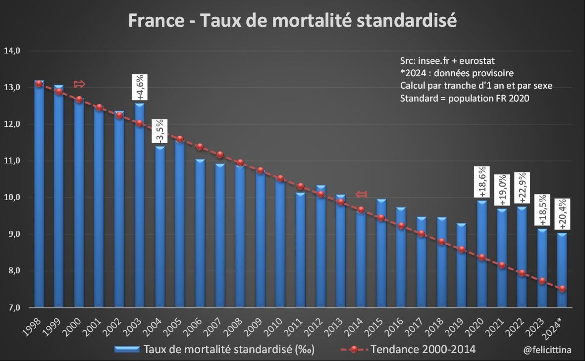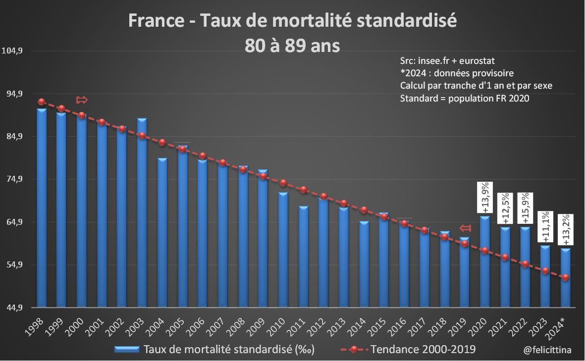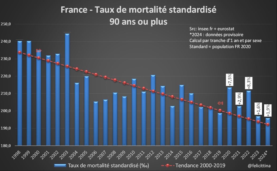 C'est particulièrement visible si on compare les taux des années 2015-2019 à la tendance 2000-2014. Notez également le pic correspondant à la canicule de 2003 et comme il a été en grande partie effacé dès l'année suivante. [3/15]