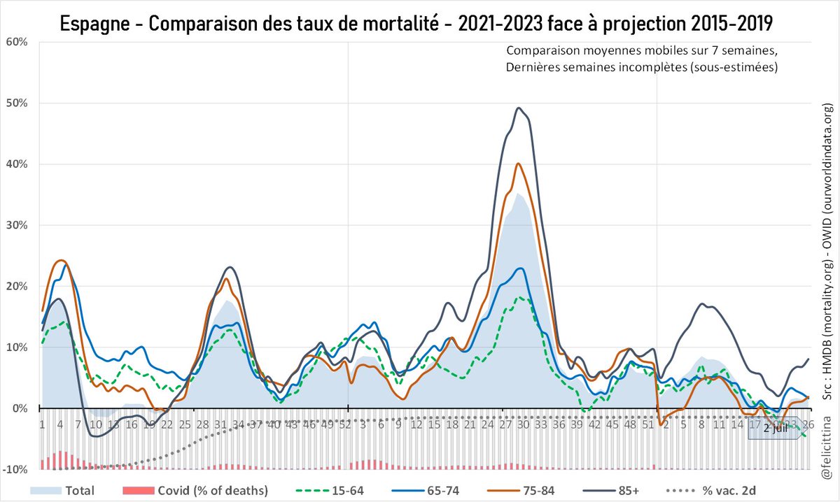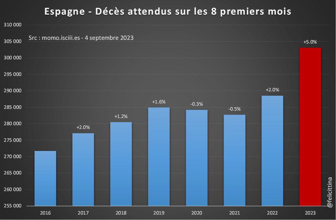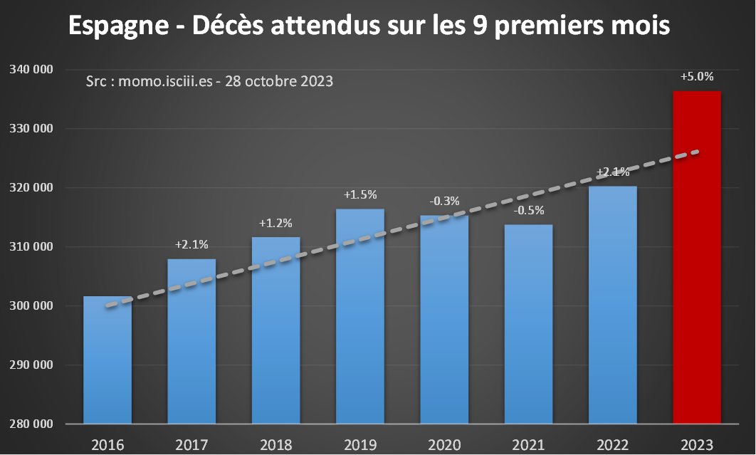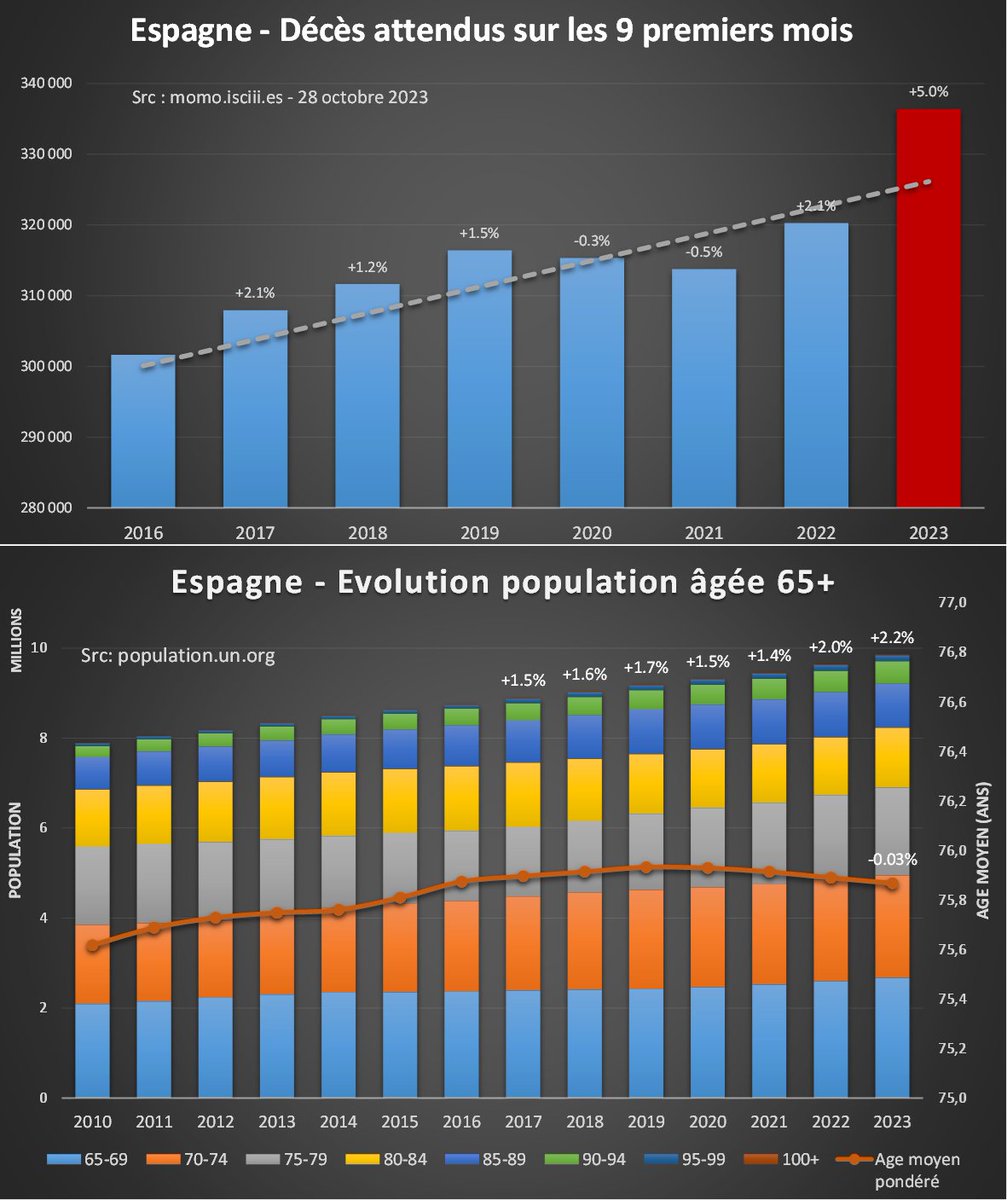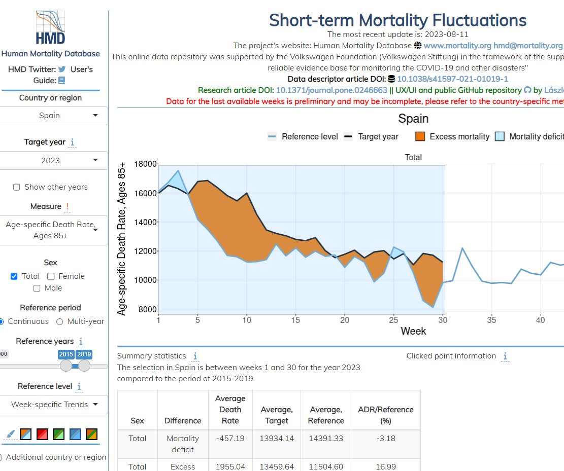 🇪🇸 L'#Espagne est l'un des rares pays à proposer un suivi des mortalités excessives en quasi temps réel. A première vue, les chiffres 2023 semblent bien meilleurs que ceux du Nord de l'Europe avec, enfin, une sous-mortalité… A première vue seulement…🤔 Lisez la suite⤵️