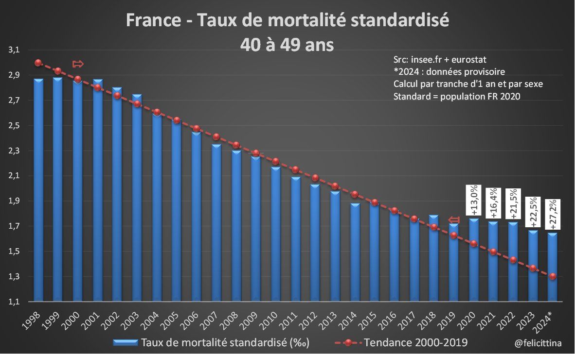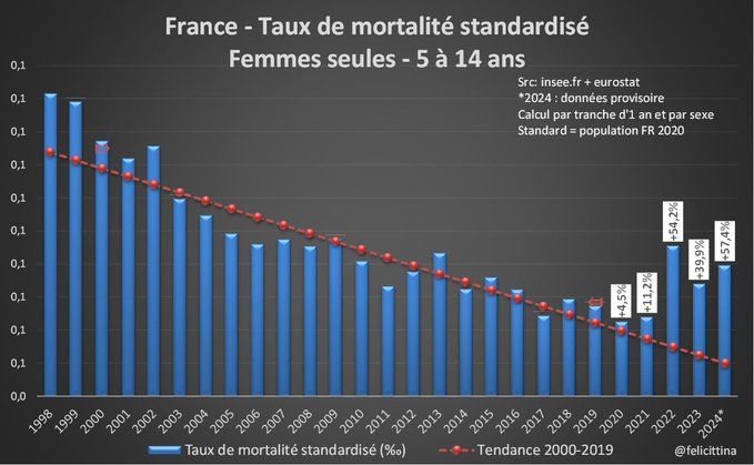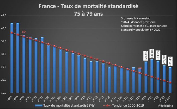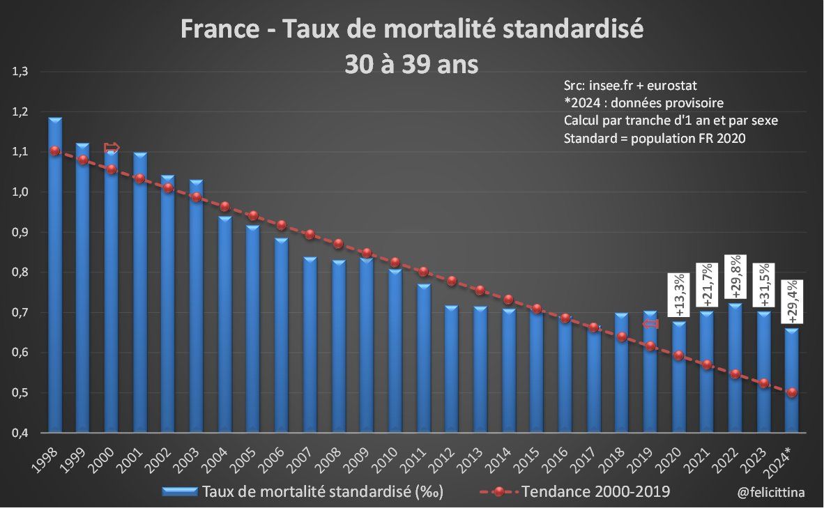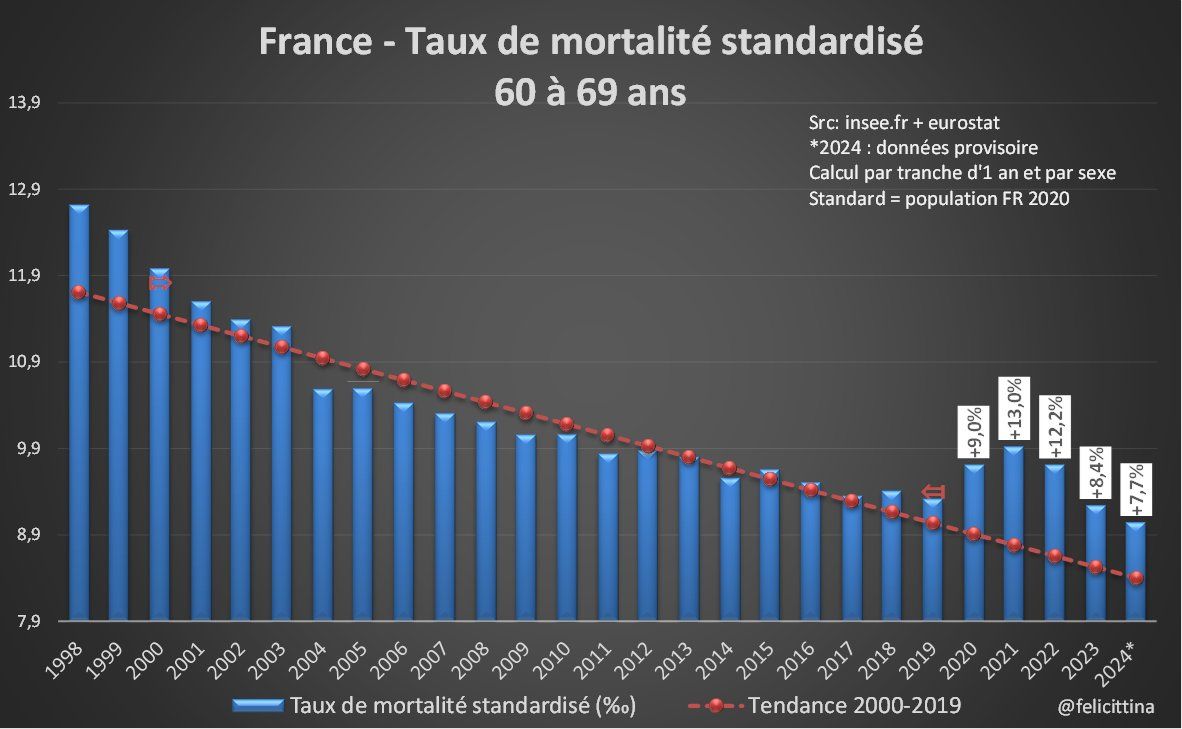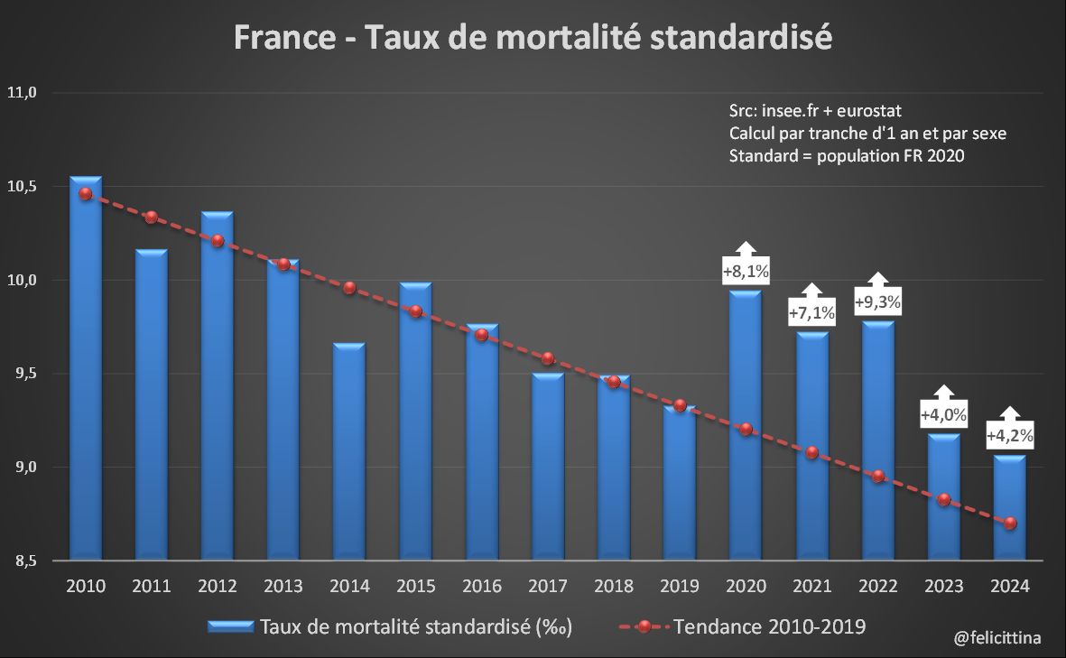 La #France ne semble finalement pas débarassée de ses problèmes de #surmortalité si on se réfère aux taux de mortalité standardisés qui éliminent l'essentiel des biais liés à l'évolution démographique. Mais c'est pire si on élargit la vision… https://x.com/felicittina/status/1863944436259905652 [1/15]