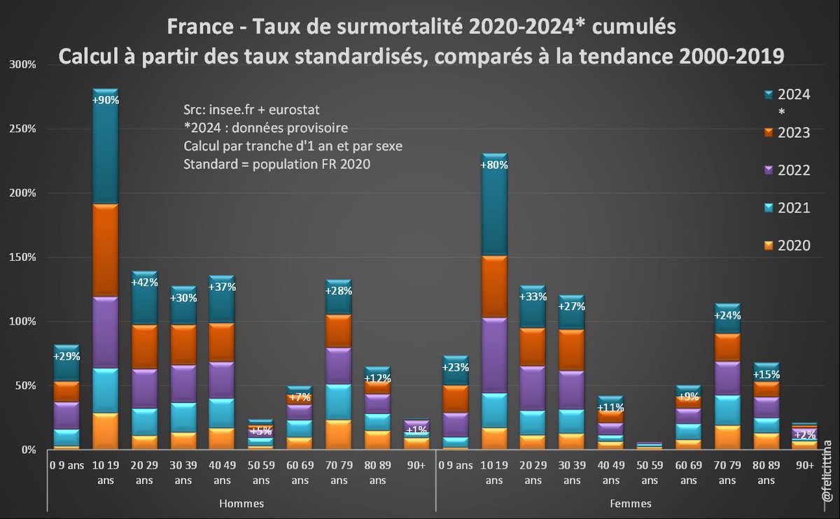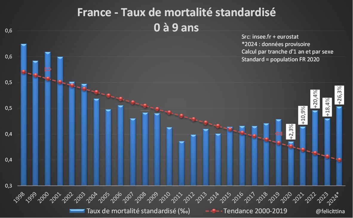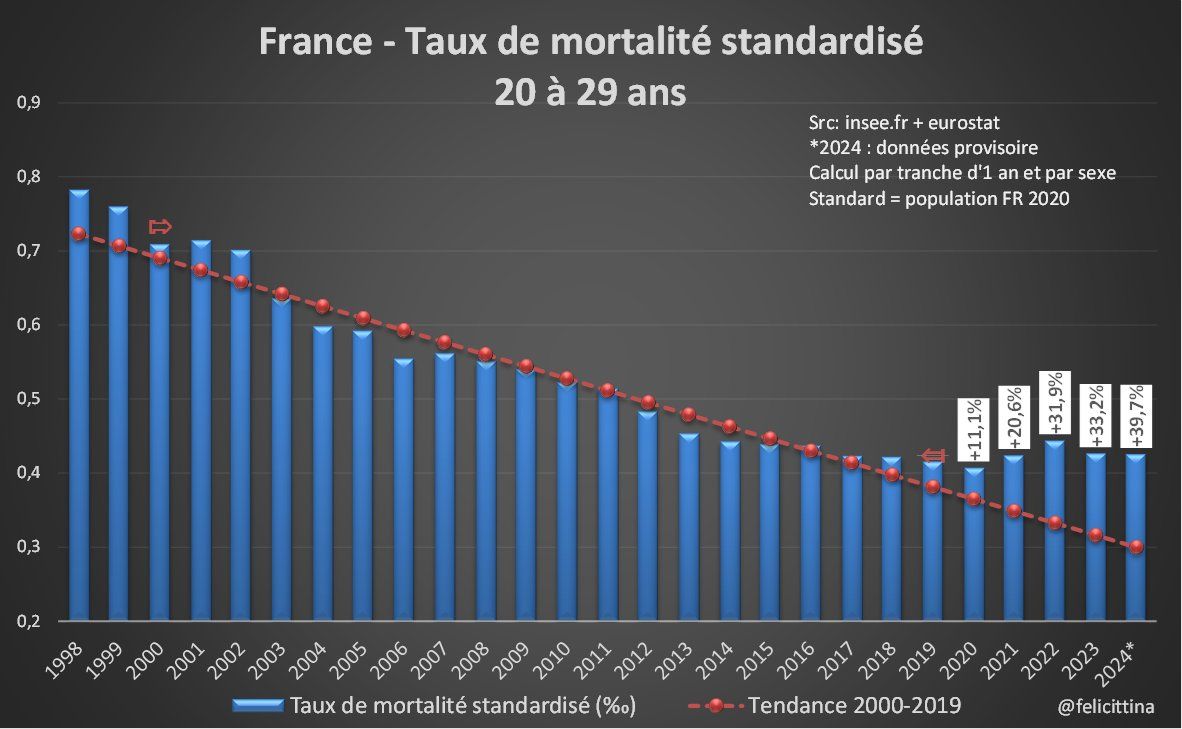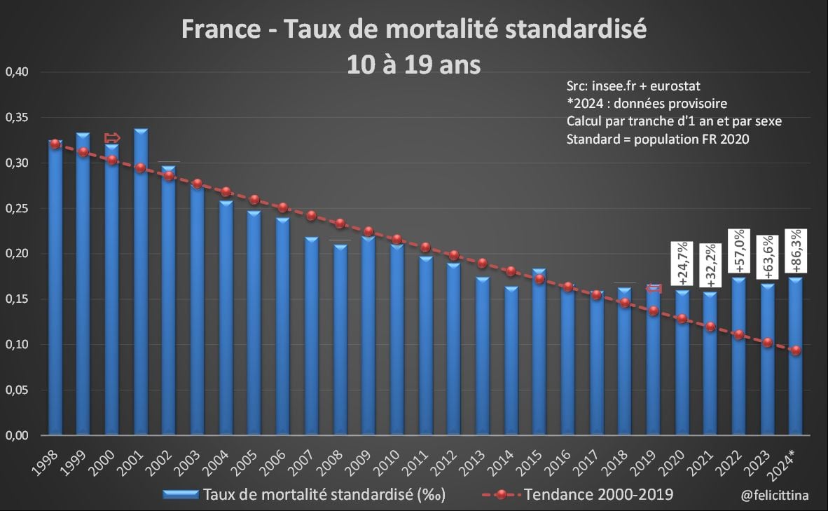 Mais bien-sûr, ce qui saute aux yeux, ce sont les énormes pourcentages pour les + jeunes. Tous les progrès en matière de santé et de prévention semblent s'être arrétés, et ceci dès 2018, voire 2015, alors que les taux de mortalité avaient été divisés par 2 depuis 2000. [6/15]