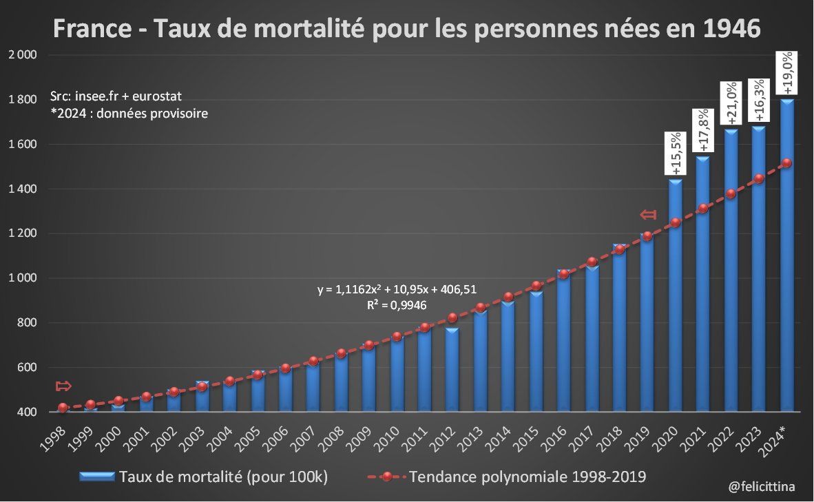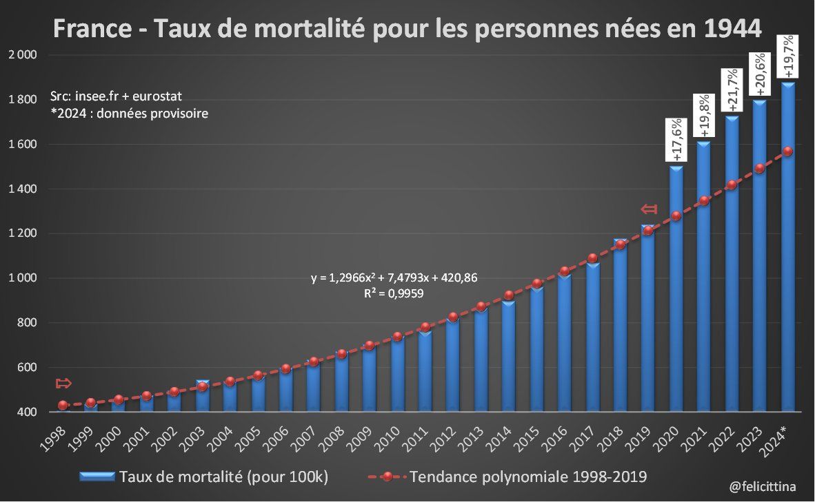 14/ Certains ont l'explication idéale e à la courbe encadrée ci-dessous : 👉le fameux baby-boom ! Regardons alors la courbe des taux de mortalité pour les seules personnes nées en 1944, avant ce bb🧨. Ca décroche quand même un peu, non ? Et pour 1946 ?⏬https://t.co/hoEq7gkoS3 https://t.co/kqTgrwAy3h