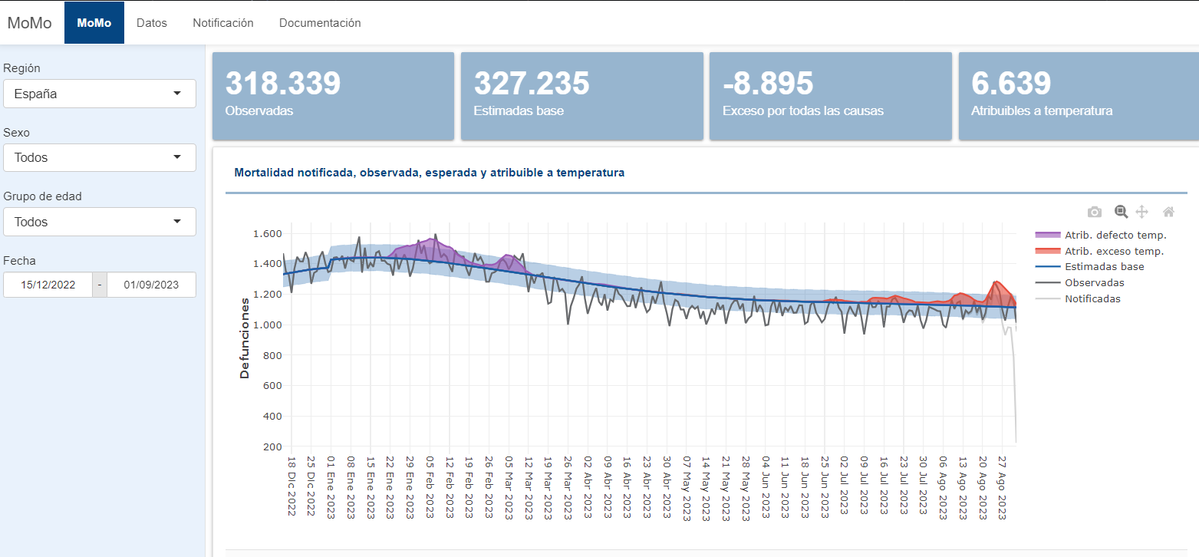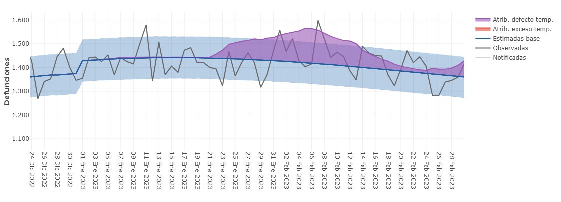 Déjà, on note une augmentation significative de la "baseline" des décès attendus au 1er janvier : environ +3,5%. [Ligne bleue : "Estimadas base"] Cela semble beaucoup, mais c'est peut-être juste un effet de seuil dû à un basculement sur la population estimée pour 2023.