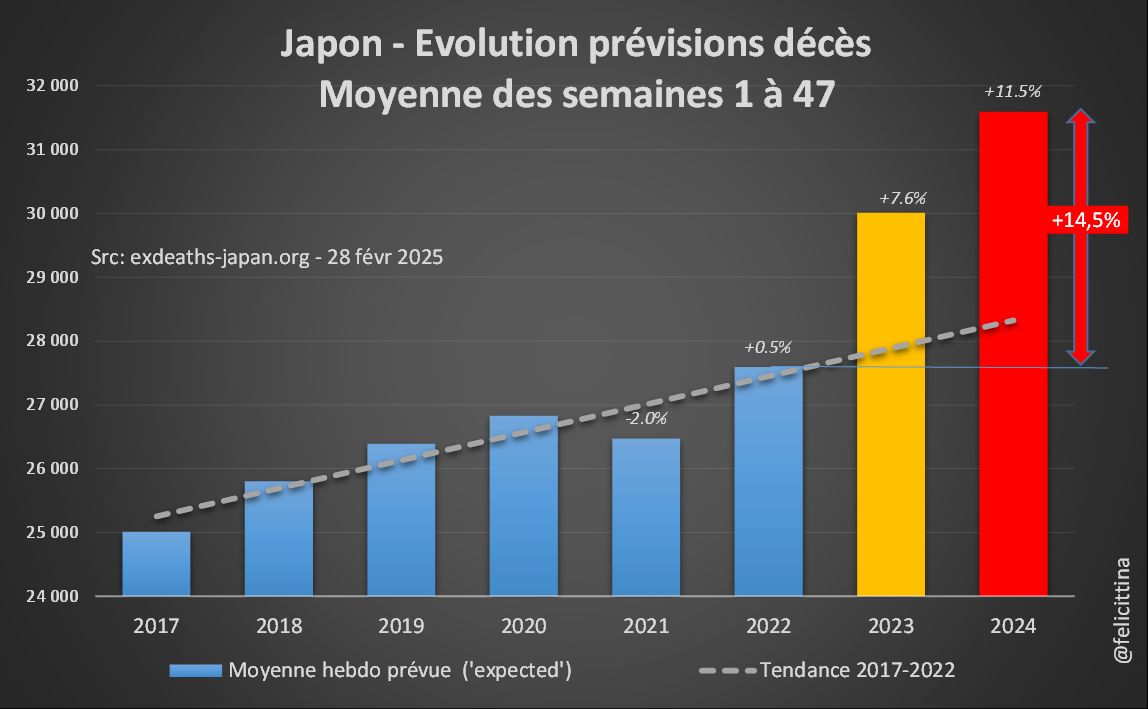 3. A l'oeil nu, l'évolution des décès "attendus" peut paraître anodine, mais téléchargeons ces données et faisons les moyennes pour les 47 premières semaines disponibles de 2017 à 2024. https://exdeaths-japan.org/data/Estimates_weighted.csv Le bond de ces "expected" est de +14,5% entre 2022 et 2024