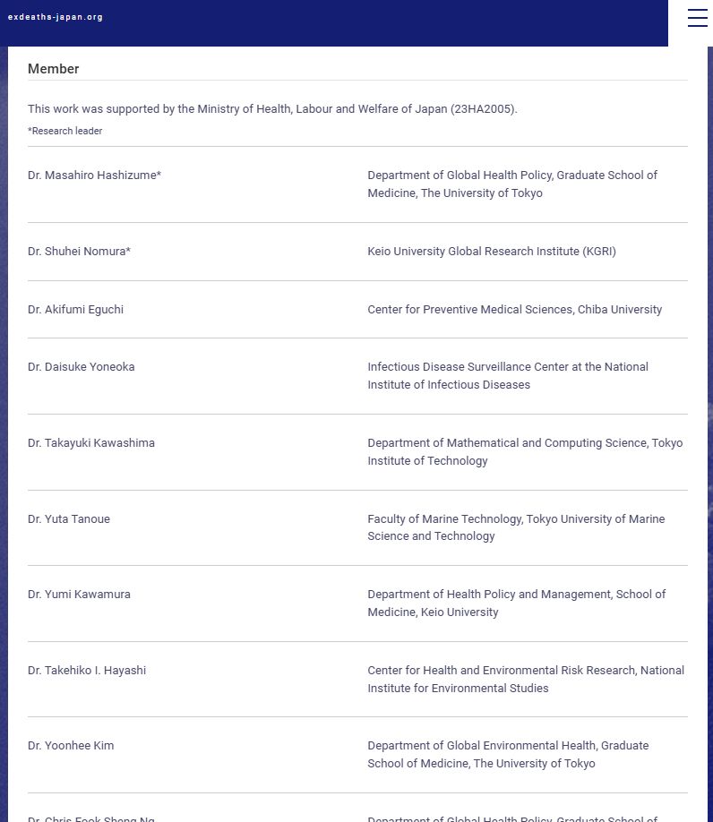 Le site exdeaths-japan est piloté par un panel de représentants du Ministère de la Santé et de nombreux organismes scientifiques, mais tous dans le secteur médical ou la biologie. Apparemment aucun démographe ni statisticien de la population. 🤔 https://exdeaths-japan.org/en [8/10]