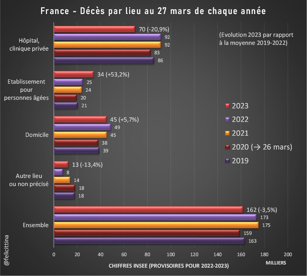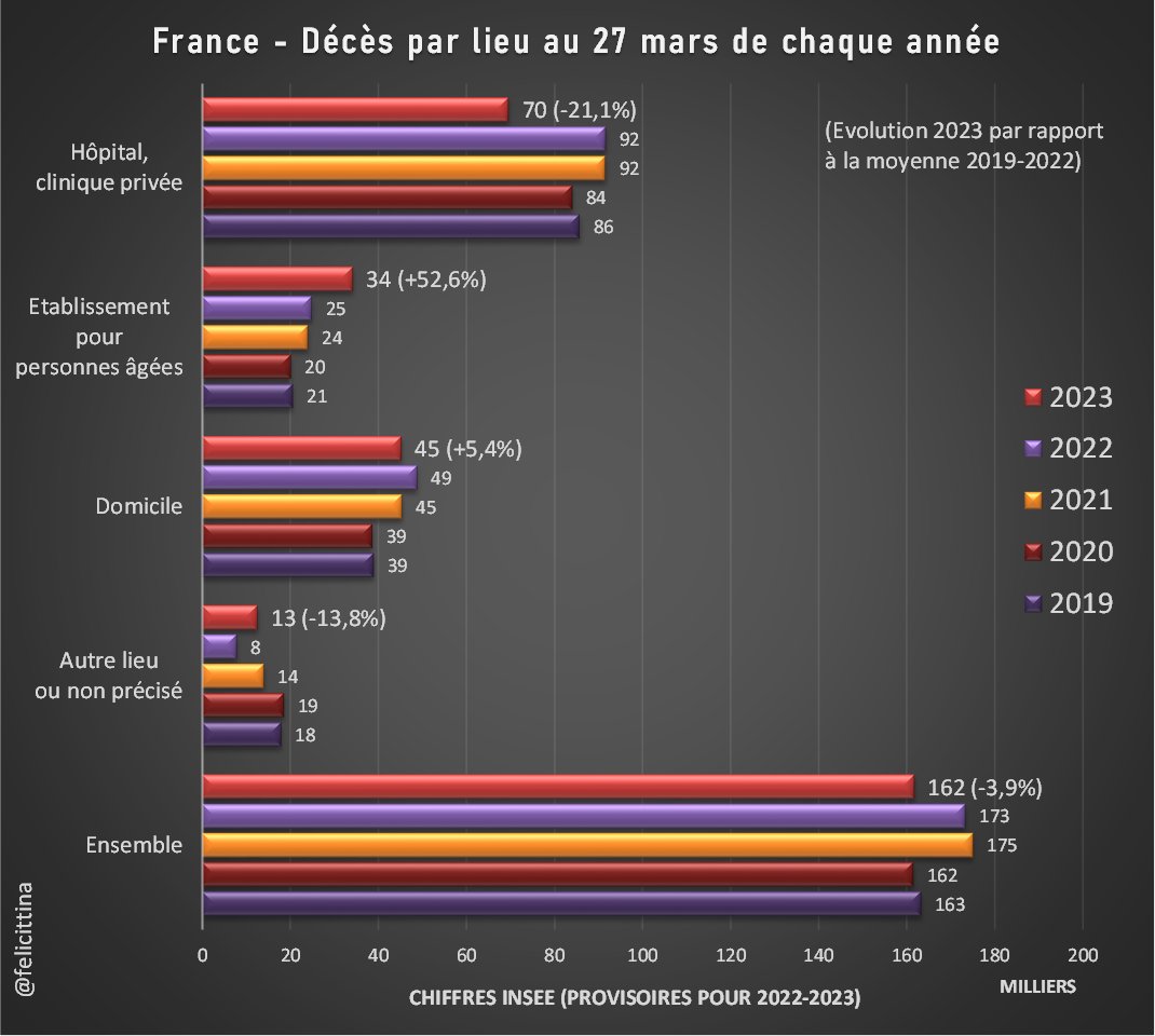 Surtout quand on voit, par exemple, dans les chiffres français d'@InseeFr, les décès diminuer de 20% dans les hôpitaux mais bondir de presque 50% en établissements pour personnes âgées. Bien plus que pendant les tristes épisodes "Rivotril" des confinements. [4/7]