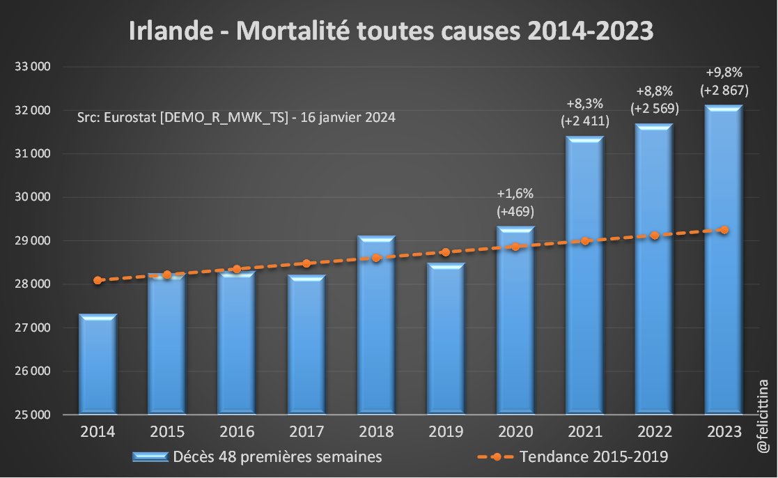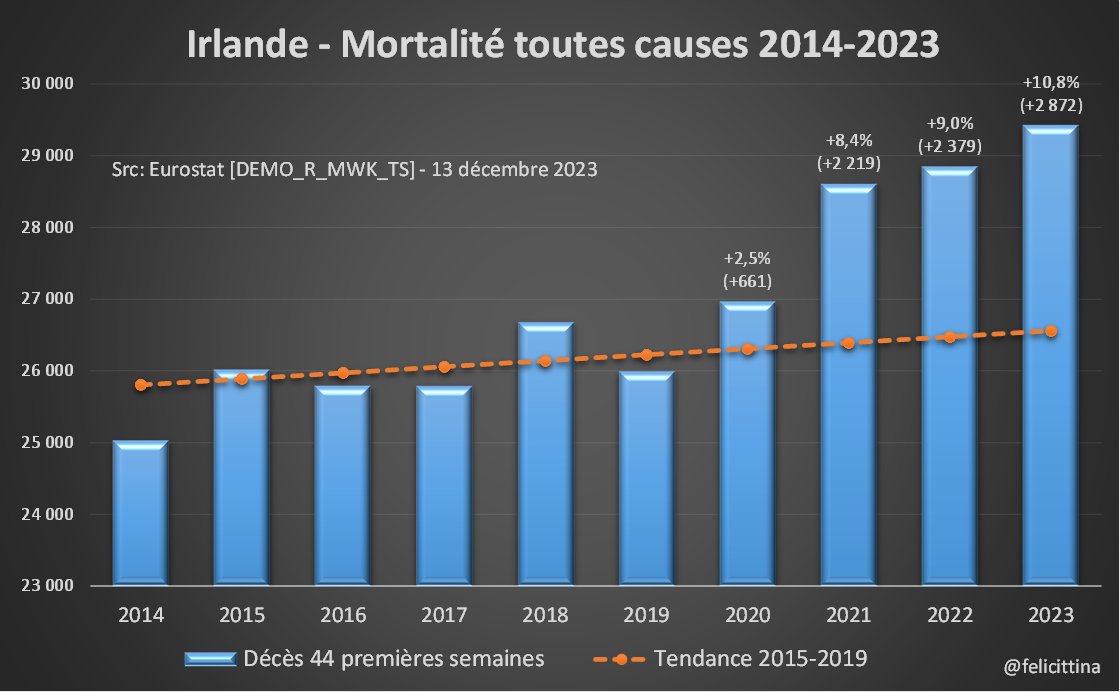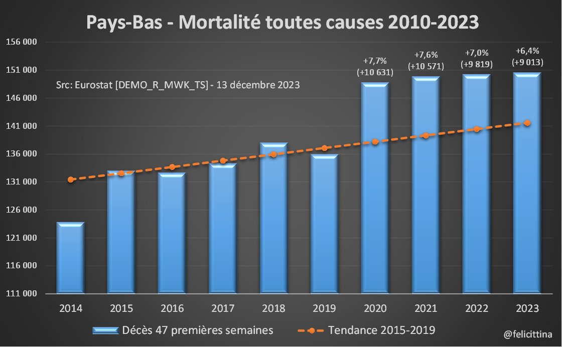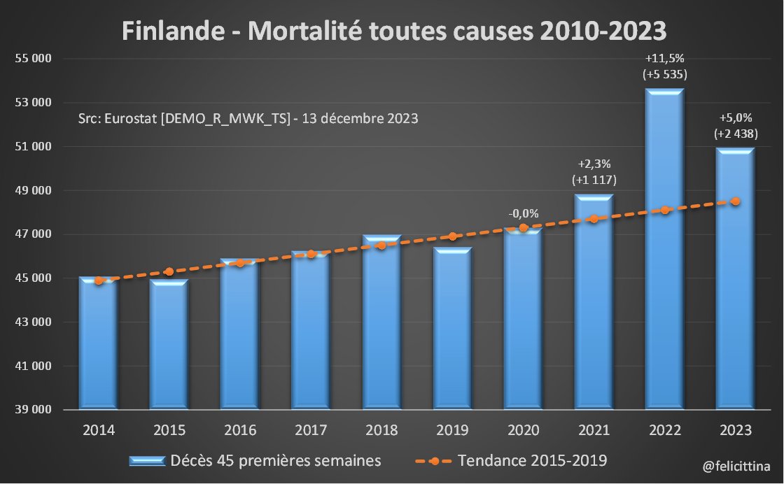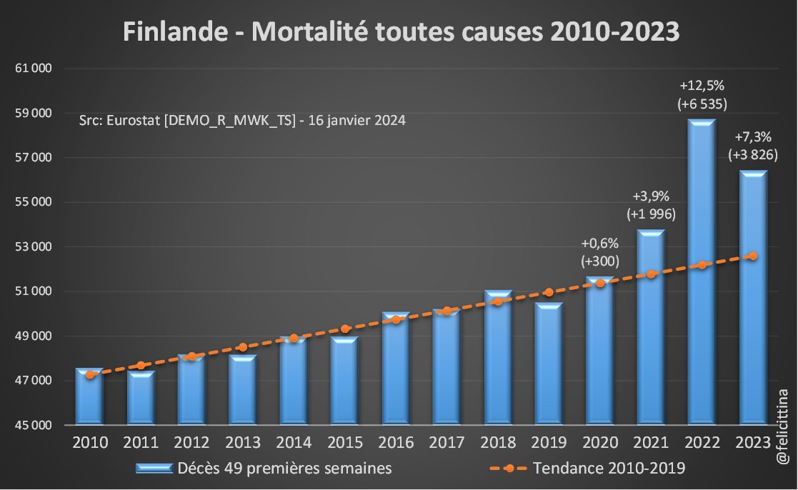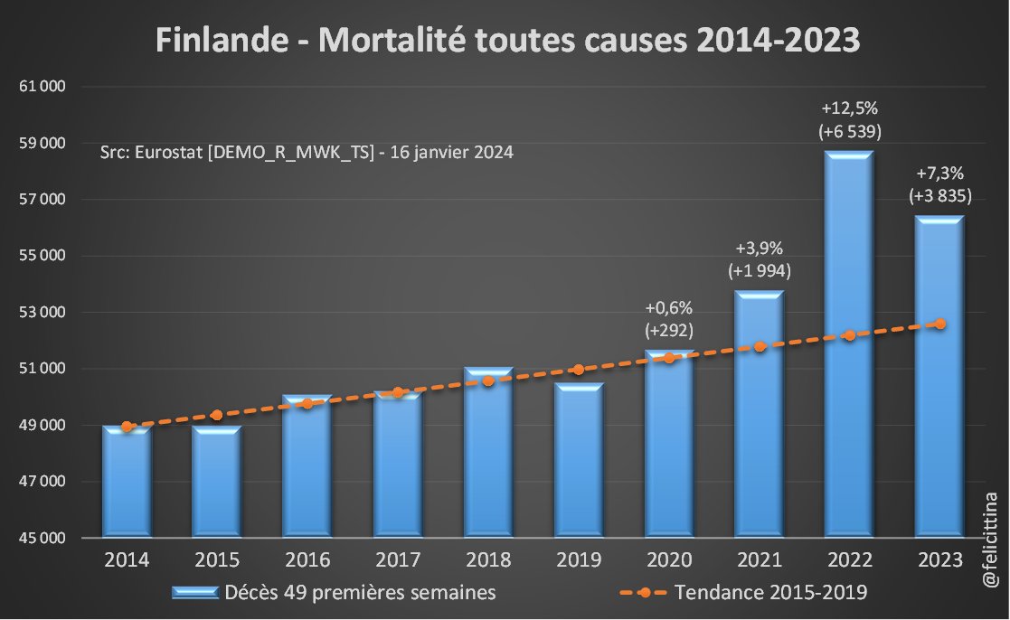 Bis repetita… Le 3e booster (5e dose) a été injecté principalement fin 2022. Or 🇳🇱🇮🇪🇫🇮, les 3 champions européens en la matière se retrouvent en 2023 avec une surmortalité similaire à celle des années précédentes, voire supérieure. Voici les derniers chiffres @EU_Eurostat