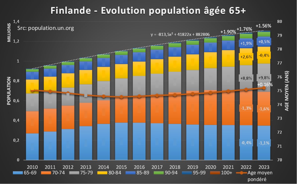 Et la démographie de la Finlande laisse plutôt présager une décélération du vieillissement de la population Le baby-boom y a visiblement été très bref, n'impactant que les 75-79 ans (environ 5% de la population pour 12% des décès totaux).