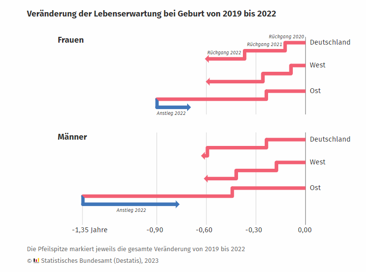 🇩🇪 #Allemagne Spectaculaire différence d'évolution de l'espérance de vie en 2022 entre l'Ouest et l'Est (0st = ex RDA). Sur ce graphe, les flèches rouges et bleues indiquent les pertes et gains en années (Frauen=♀️ , Männer=♂️ ) . https://destatis.de/DE/Presse/Pressemitteilungen/2023/07/PD23_293_12621.html [1/6]