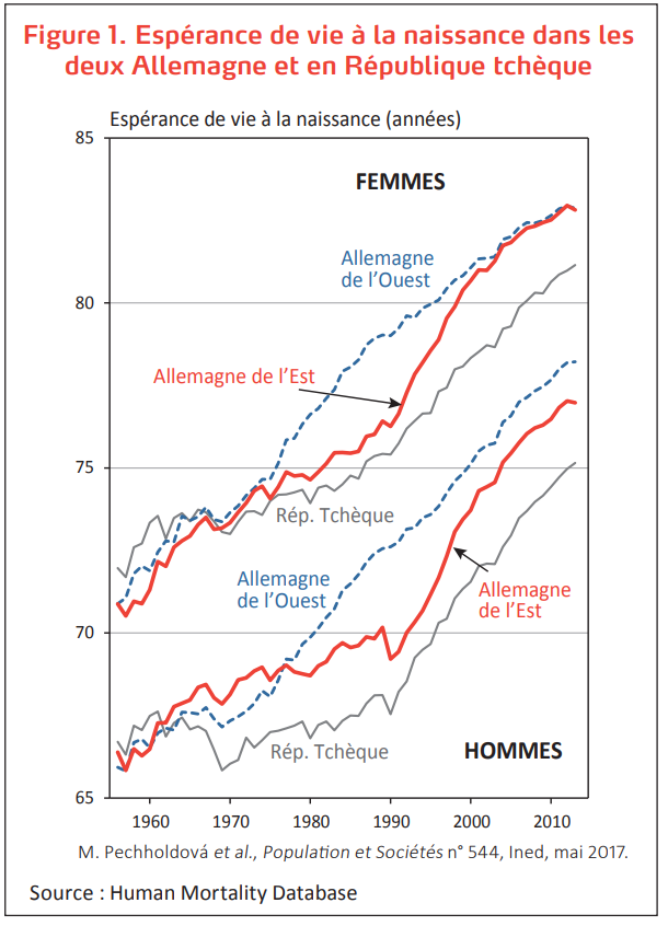 Comme il est intéressant de connaître la situation de départ, il y a cette publication déjà ancienne de l'INED qui montre des chiffres égaux pour les femmes et légèrement supérieurs à l'Ouest pour les hommes (~1,3 ans). https://www.ined.fr/fr/publications/editions/population-et-societes/esperance-de-vie-les-deux-allemagne-depuis-la-reunification/#tabs-1 [5/6]