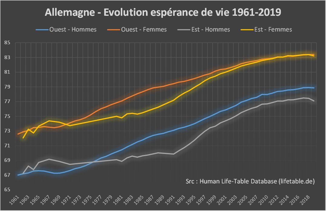 Des chiffres plus récents sont disponibles sur @HMDatabase et montrent une évolution parallèle pour les femmes et légèrement défavorable à l'Est pour les hommes, avec un écart montant à 1,7 ans en 2019 (78,8 contre 77,1). https://www.lifetable.de/Country/Country?cntr=DEU [6/6]