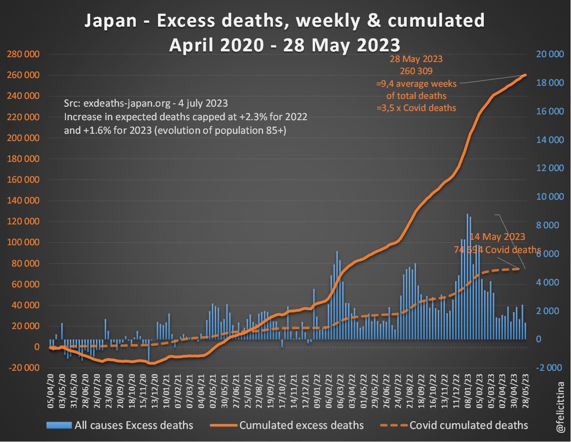 Tout semble donc indiquer que les chiffres auraient été manipulés pour transformer une surmortalité persistante en sous-mortalité. Et cela ne semble pas un cas isolé, car on trouve de la même façon un bond de +6,8% des décès attendus pour le #Japon. #McKinsey à la manoeuvre ?