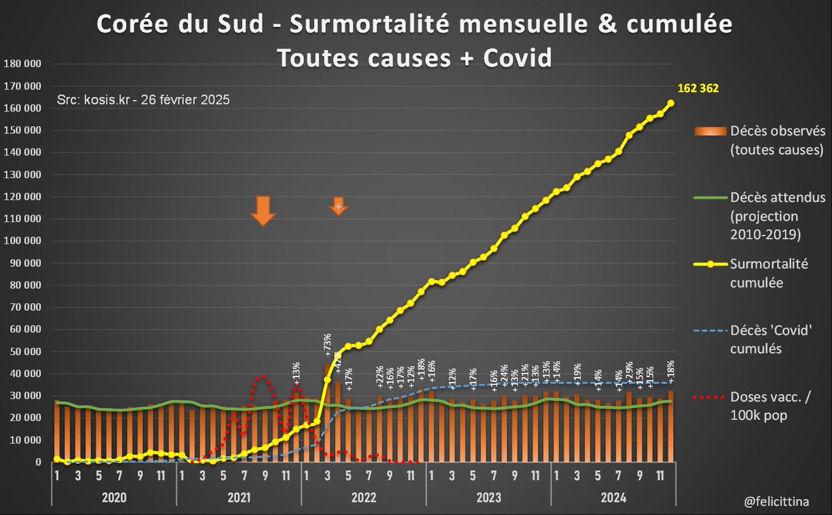 En #Corée, les autorités semblent très satisfaites d'avoir des décès 2024 inférieurs à ceux de… 2022. Japon & UK transforment les #surmortalités en sous-mortalités⤵️, la Corée se contente de les ignorer😩 Et en cumul, ça donne quoi ? ⏬ [1/7]https://x.com/felicittina/status/1874024690278096995