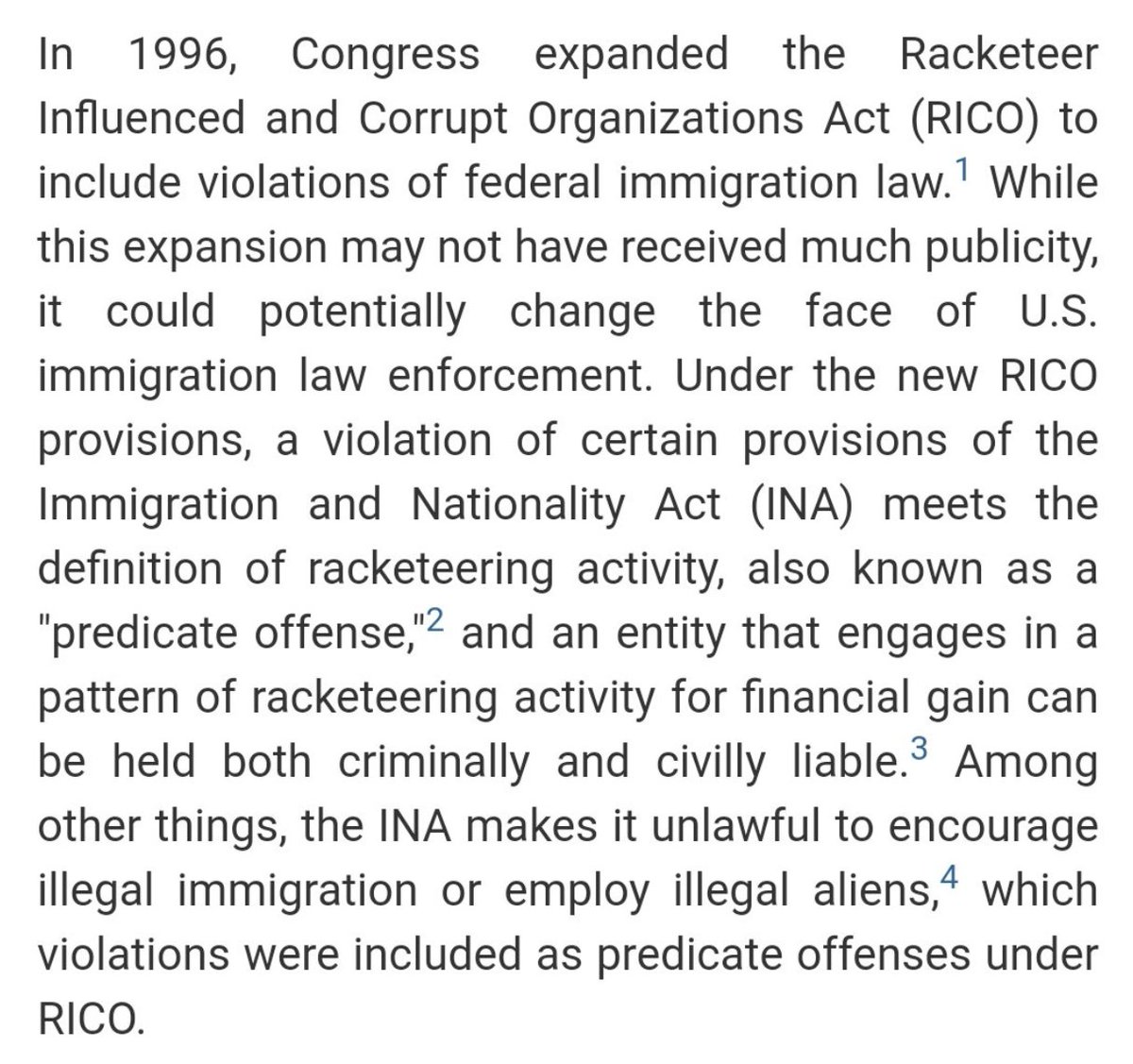 Did you know: Encouraging illegal immigration is a RICO predicate offense Countless thousands of people employed at NGOs have been engaging in this activity for decades. You might now be wondering why hasn't the FBI raided a single one of their offices / executives.......