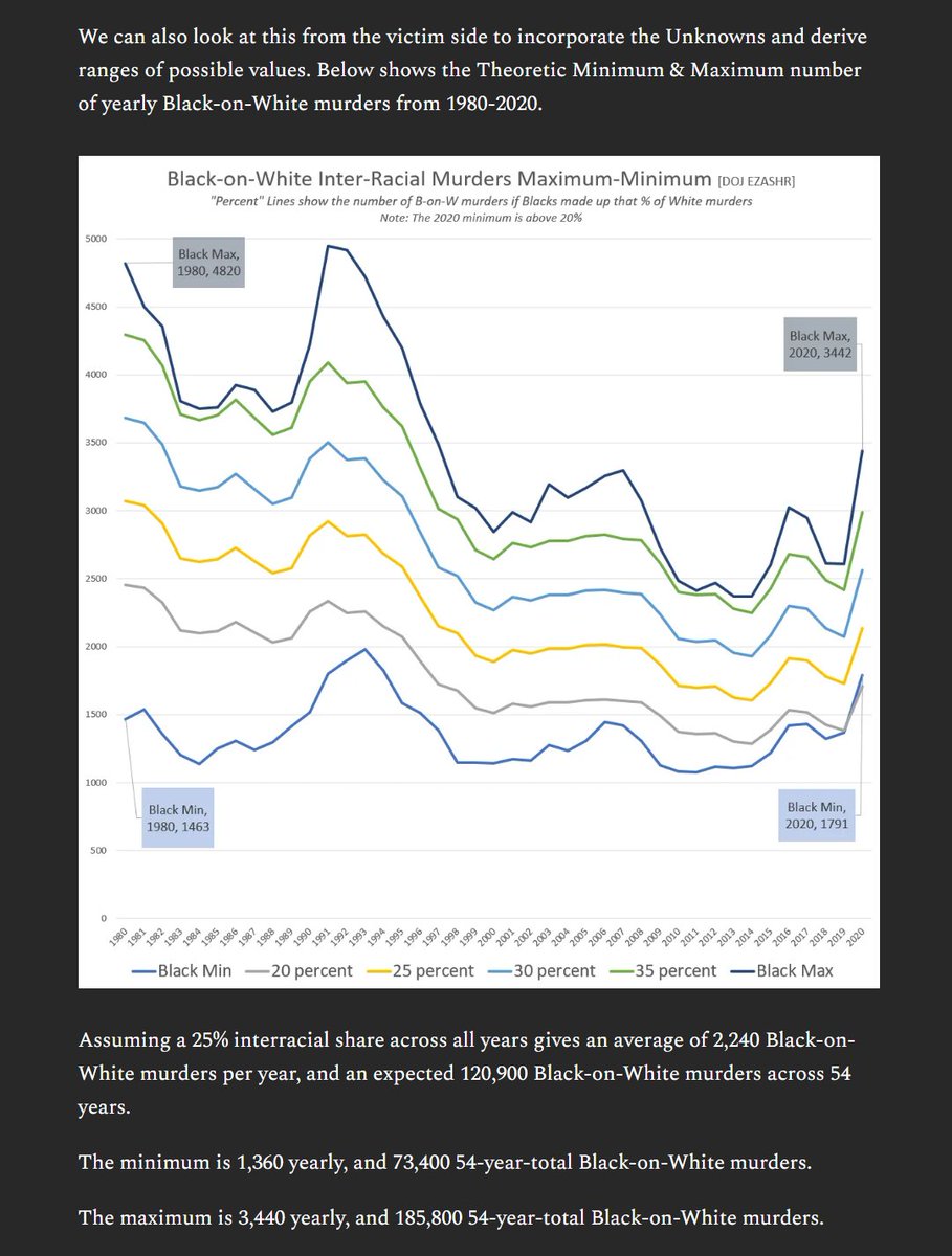~~UPDATED on substack~~ We can stake out the minima & maxima by incorporating Unknowns Ex: In 2020, the absolute minimum B-on-W is over 20% Note the 80s-90s -- the period of greatest B-on-W violence -- tons of White victims had Unknown assailants Read: https://datahazard.substack.com/p/interracial-murder