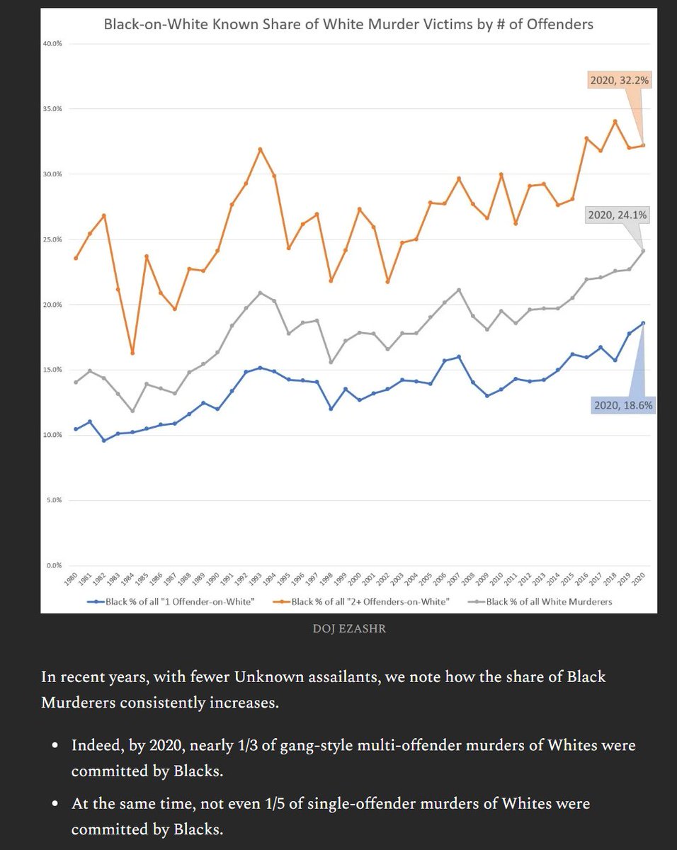 As of 2020, Blacks committed: - Nearly 1/3 of gang-style multi-offender murders of Whites - Less than 1/5 of single-offender murders of Whites - Overall, almost 1/4 of all murders of Whites with a known number of offenders Back in the 1980s, more murders had unknown offenders https://t.co/R4YxSgsMmZ