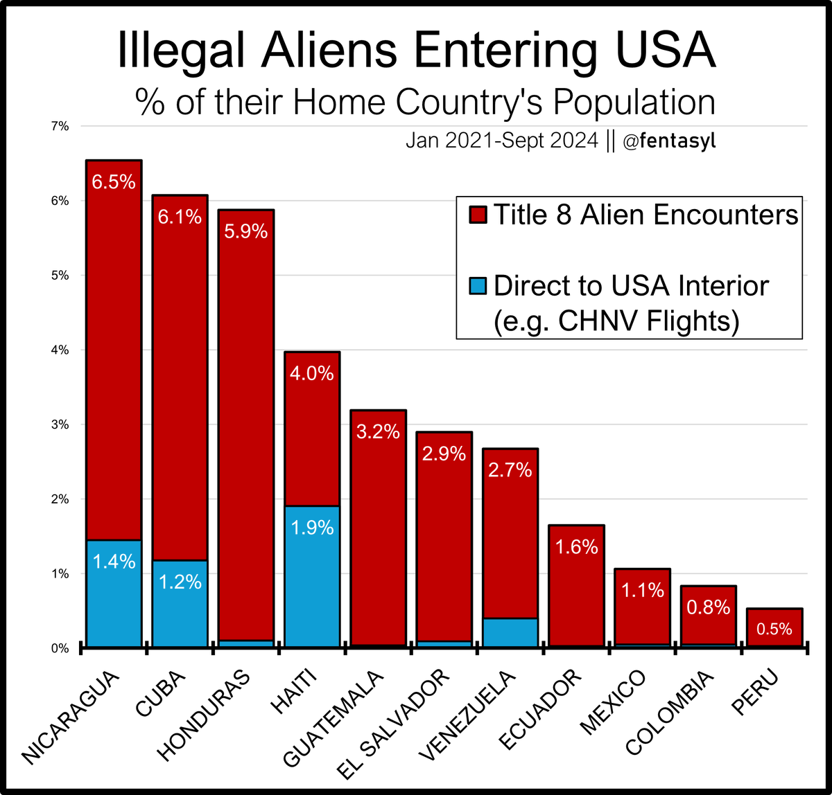 - 4% of the entire population of Haiti has entered the USA through irregular means during this administration. - Half of these Haitians were flown in on the Kamala Express. - ~6% each of the populations of Nicaragua, Cuba, & Honduras have entered the USA since Jan 2021. Note: For context, I've graphed "All Alien Encounters" here which includes "Expulsions." It should be obvious why those numbers are merely contextual.