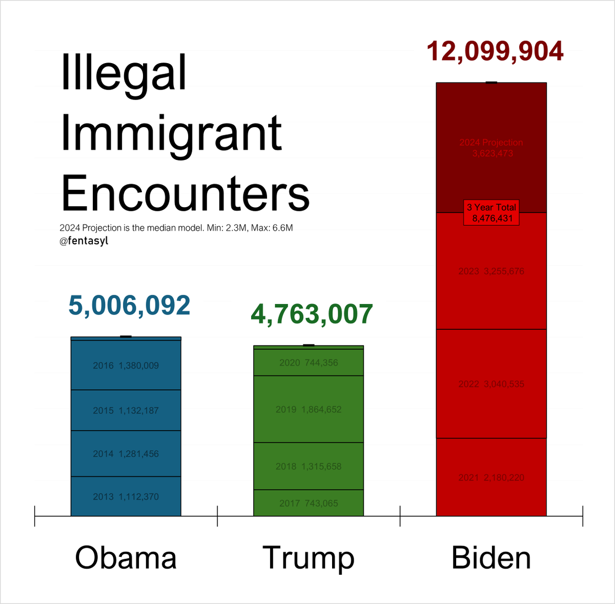 By all available metrics, this administration's border policy is a disaster. Monthly Encounters have averaged: - 98,000 for the two previous administrations. - 242,000 for the Biden border. In fact, the flood of humans entering is so vast that Apprehensions alone now exceed the combined Encounters metric of the previous administrations. Monthly Apprehensions have averaged: - 34,000 for the previous two administrations. - 111,000 for the Biden border. And these averages understate the current situation -- it's getting worse every month. December 2023 was the worst single month in history at the southern border.