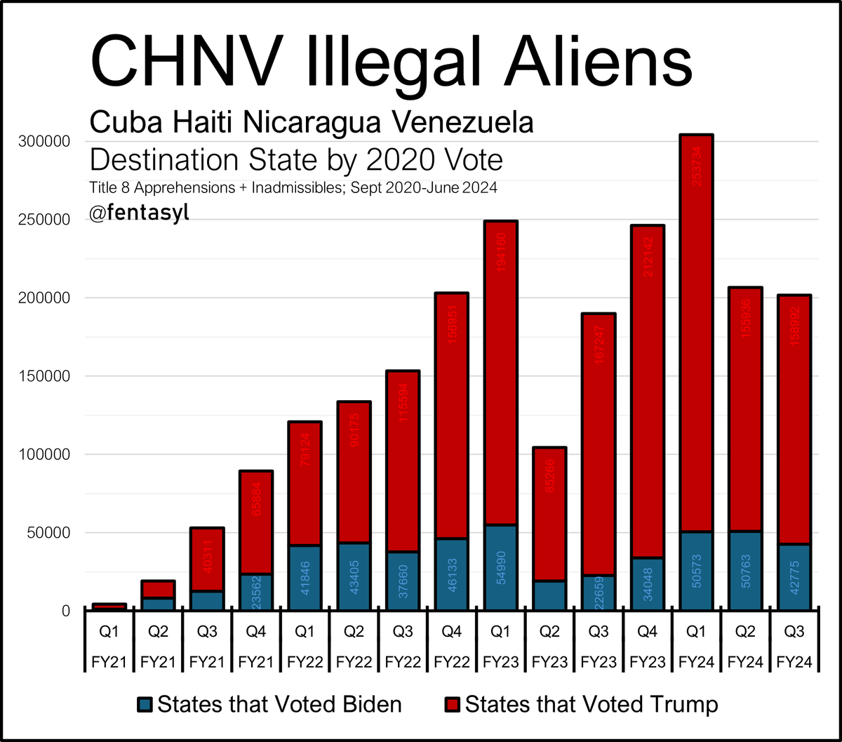 Biden-Harris' CHNV Airplane Importation program was targeted to punish those who vote against the Dems -- 121% of the burden went to Red States. Since CHNV began (Jan 2023) there have been: - 280,000 more to Red States. - 49,000 fewer to Blue. That's about: - 58,000 per month for Red States - 12,000 per month for Blue in the CHNV era. Up from: - 28,000 per month for Red States - 10,000 per month for Blue for the first 2 years of this Administration.