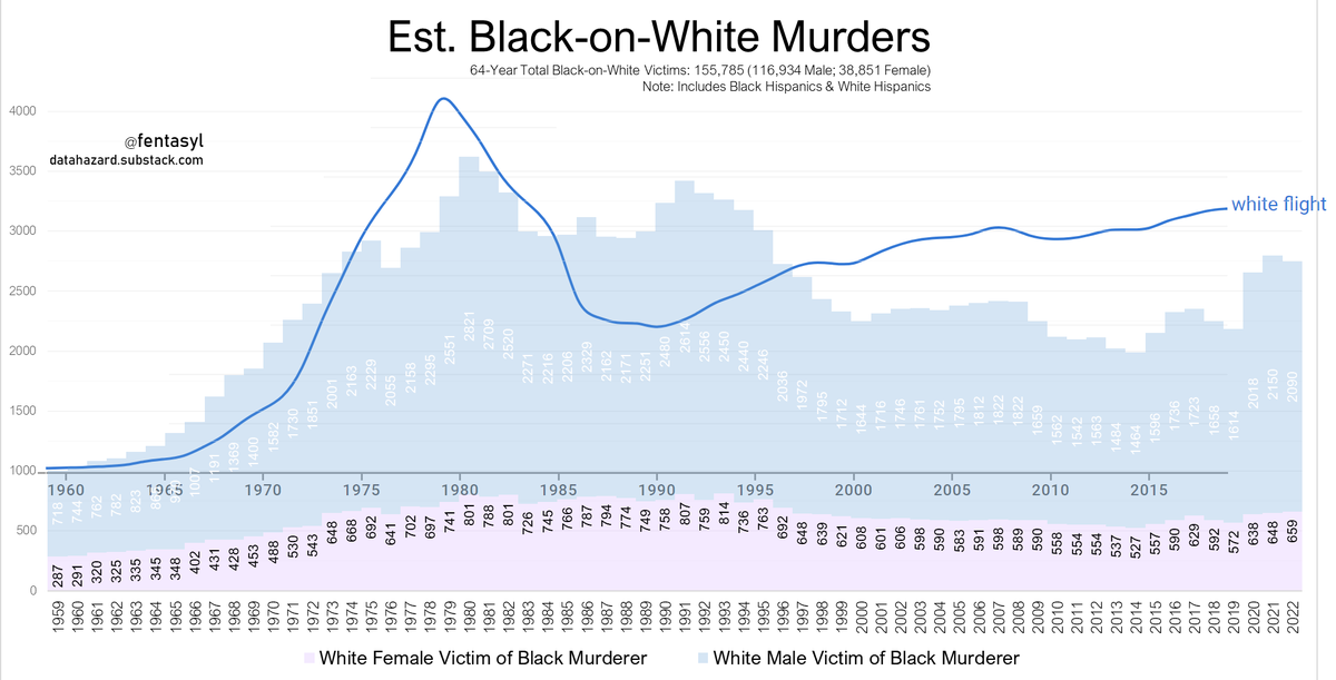 Since 1968, there have been over 193,500 Interracial Murders, including: ~35,000 White Women murdered by Blacks (85.4% of Female total) ~6,000 Black Women murdered by Whites (14.6% of Female total) ~145,500 White Victims of Blacks (75.3% of total) ~48,000 Black Victims of Whites (24.7% of total)