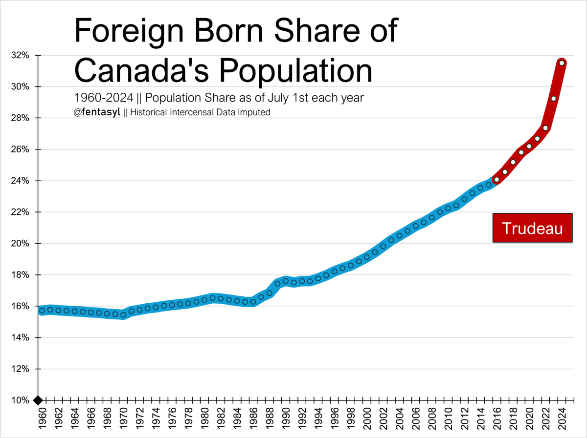 What does it look like when a far-left open-borders government gets reelected? For Canada, it means the Foreign-born share of the population increases from 24% in 2016 to ~34% by the time Trudeau gets voted out in Oct 2025. Including children with 2 foreign parents? That's Half of Canada's population now. And that doesn't include Canada-born children with only 1 Foreign-born parent. Imagine what the Kamala-Mayorkas border policy will look like in a 2nd term. Justin Trudeau shows us one potential future.