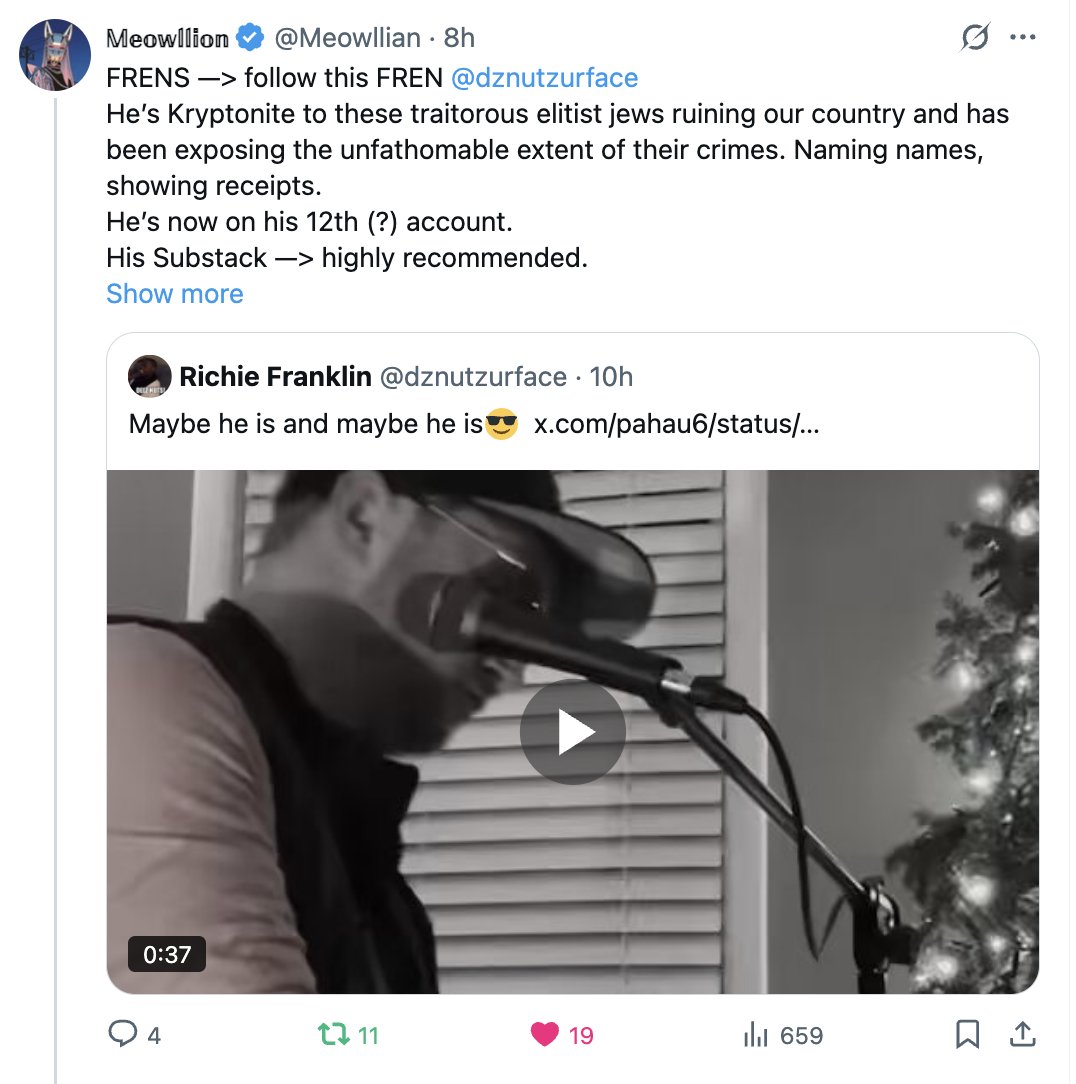 FRENS —> follow this FREN @dznutzurface He’s Kryptonite to these traitorous elitist jews ruining our country and has been exposing the unfathomable extent of their crimes. Naming names, showing receipts. He’s now on his 12th (?) account. His Substack —> highly recommended. His loyal archivist @KettyLuvz 🤍 https://open.substack.com/pub/decentfijc?utm_source=share&utm_medium=android&r=5czpwi
