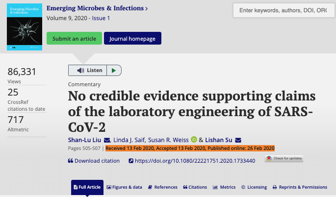 1/ Here, I will expose a well organised and very questionable framing of the SARS2 origins. The core of the story is the drafting in February 2020 of a commentary denying any possible man-made virus. It is not often discussed, but is very revealing. https://www.tandfonline.com/doi/full/10.1080/22221751.2020.1733440?scroll=top&needAccess=true https://t.co/r10CbdXduW