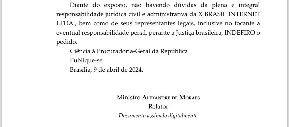 Earlier today, Brazilian Supreme Court judge Alexandre de Moraes explicitly threatened all X employees in Brazil with criminal prosecution. Musk claimed that X's employees feared arrest and Brazilian media strongly implied he was lying. This proves the fear was well-grounded: